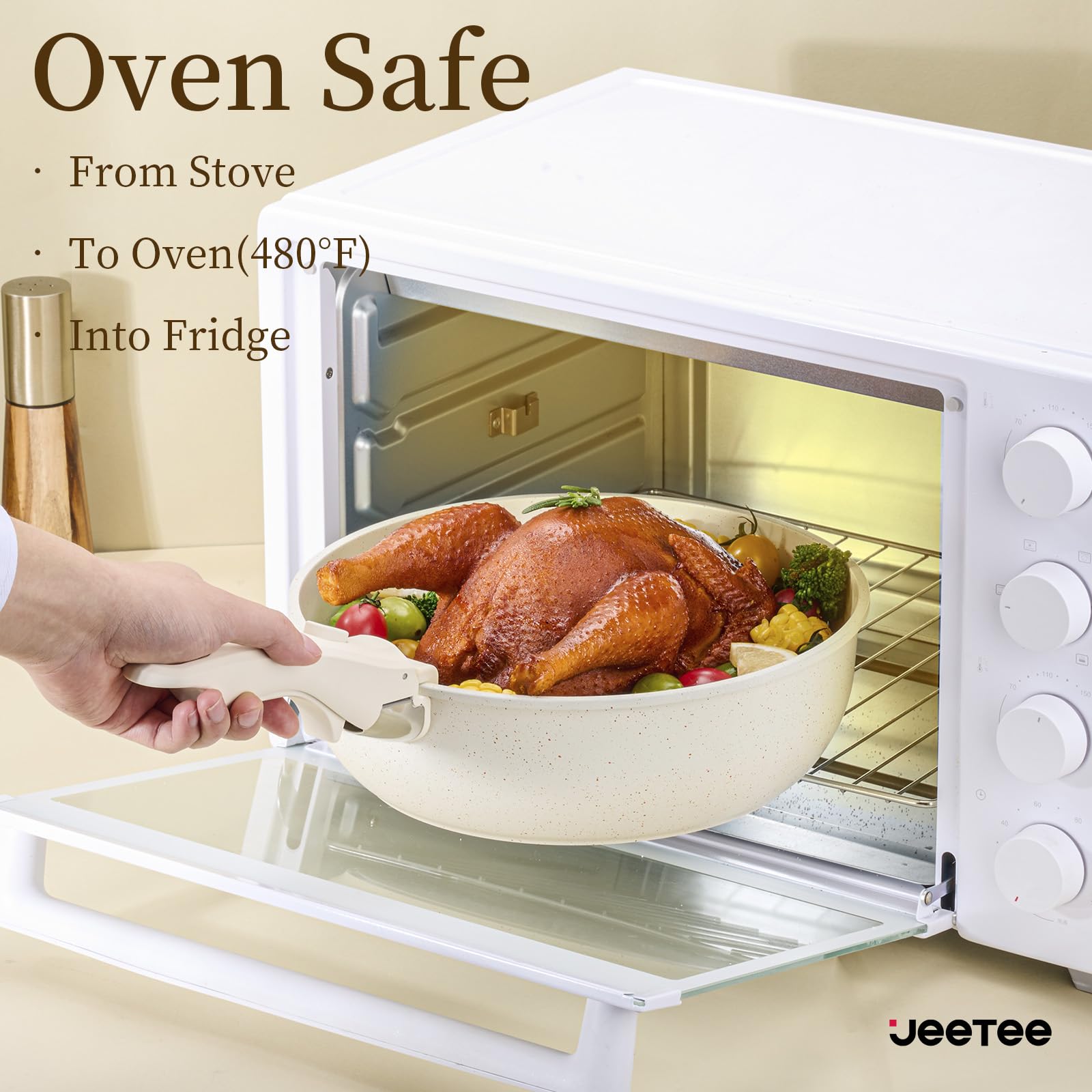 Ja, das Kochgeschirr ist backofenfest bis zu einer Temperatur von 175°C (350°F). Das macht es perfekt zum Backen oder Überbacken. Bitte entfernen Sie vor dem Gebrauch im Ofen immer den abnehmbaren Griff.