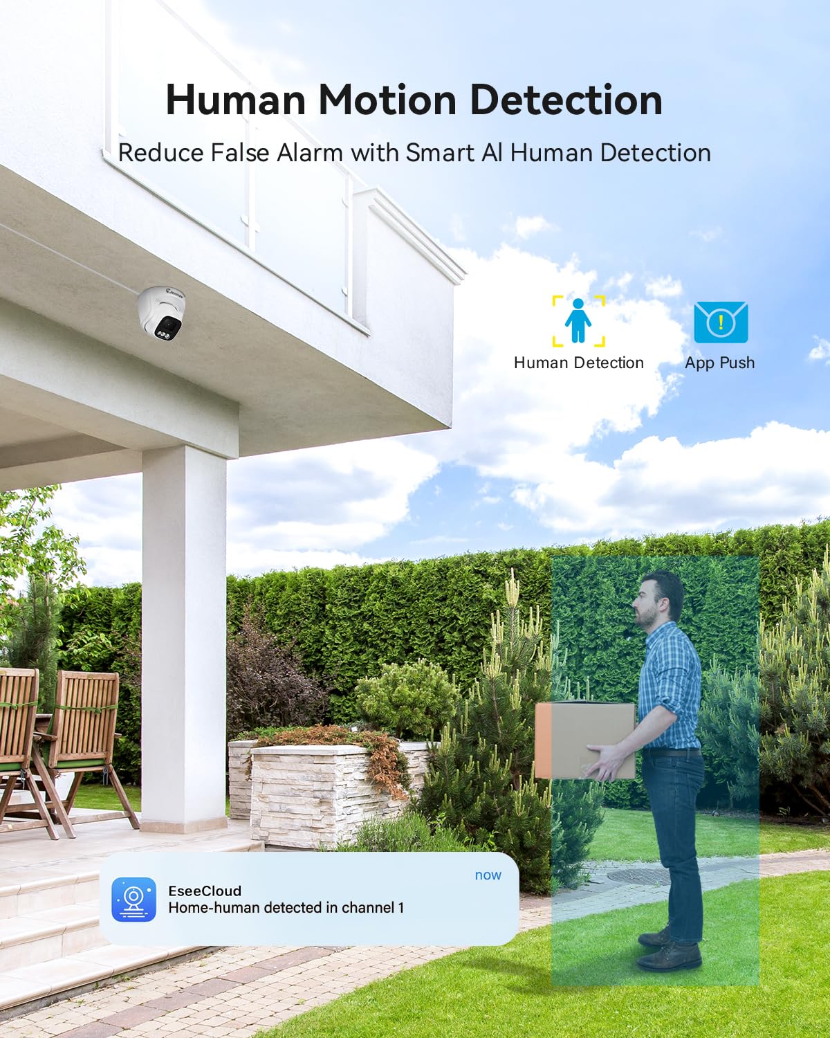 Das System nutzt eine KI-gestützte Personenerkennung, die präzise zwischen Menschen und anderen Bewegungen (z.B. durch Tiere oder Blätter) unterscheidet, um Fehlalarme zu minimieren. Bei Erkennung einer Person kann ein Ton- und Lichtalarm ausgelöst werden. Da es sich um einen 10-Kanal-NVR handelt, können Sie das Set jederzeit mit bis zu 8 weiteren kompatiblen Kameras erweitern.