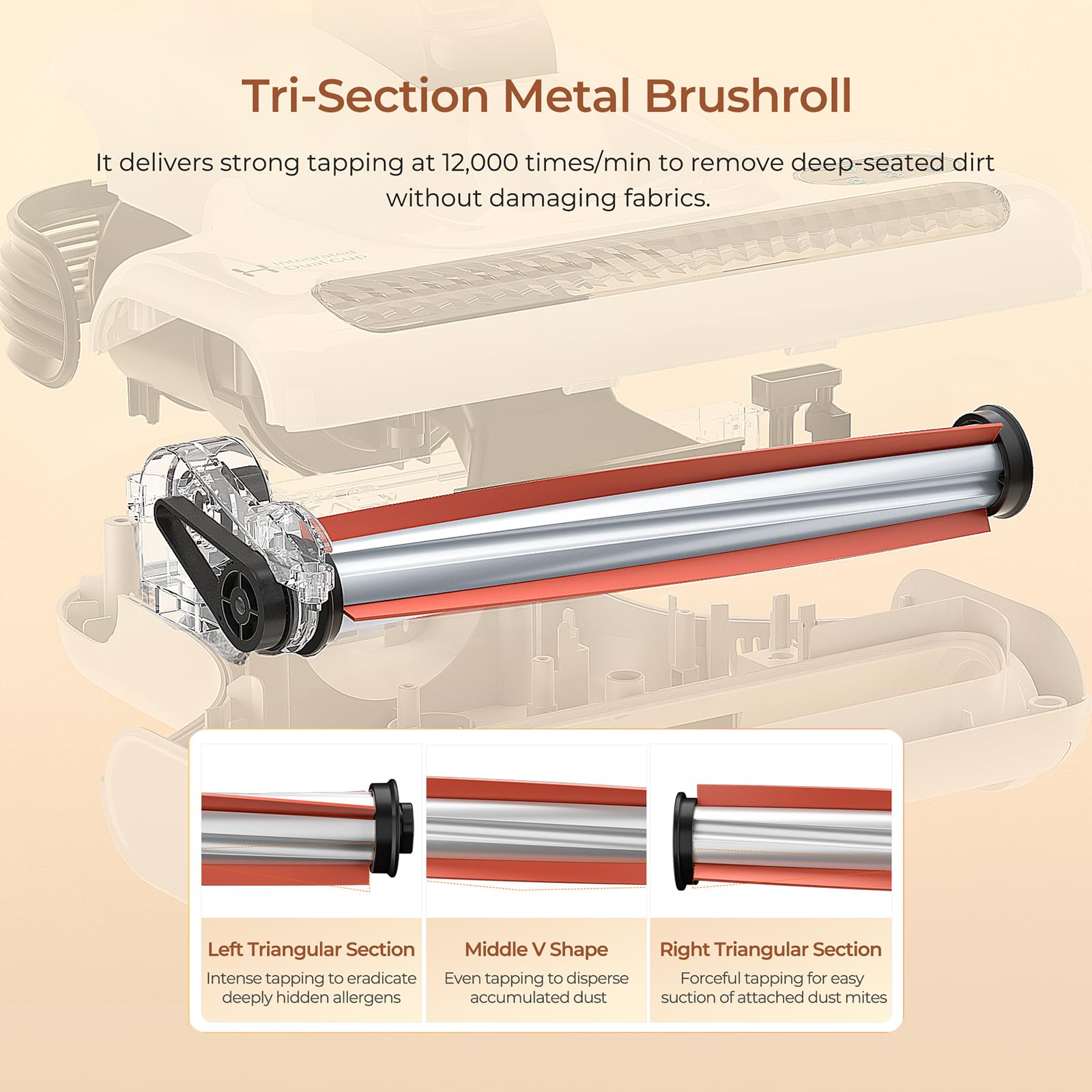- Patentierte Metall-Rollbürste: Die Bürste arbeitet mit 12'000 Vibrationen pro Minute, um selbst hartnäckigste Partikel aus der Tiefe zu lösen, ohne dabei empfindliche Stoffe zu beschädigen.