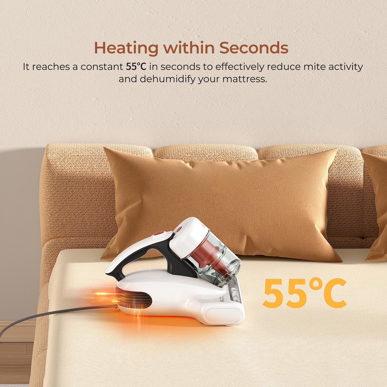 - Multi-Technologie-Reinigung: Kombiniert 253,7 nm UV-C-Licht, Ultraschall und 55 °C Heissluft, um Milben und Bakterien wirksam zu eliminieren und deren Wachstum langfristig zu hemmen.