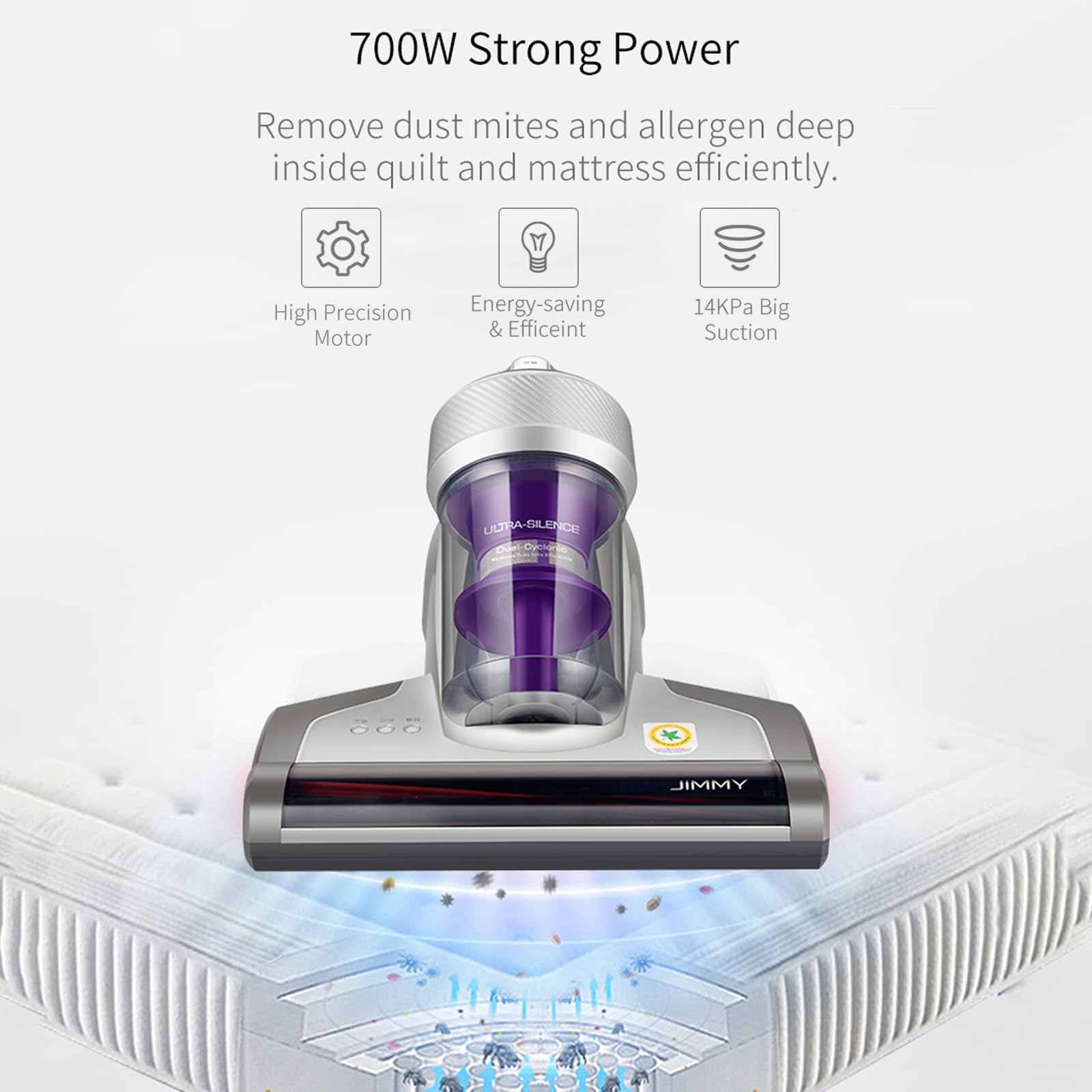 Der Jimmy JV35 kombiniert vier Reinigungstechnologien: Ein starker 700W Motor mit 14 kPa Saugkraft entfernt lose Partikel, eine rotierende Klopfbürste löst tiefsitzenden Schmutz aus den Fasern, eine 60°C Heissluft-Funktion entzieht Milben die Lebensgrundlage durch Trocknung und das integrierte UV-C-Licht sterilisiert Oberflächen und neutralisiert bis zu 99,9% der Bakterien.