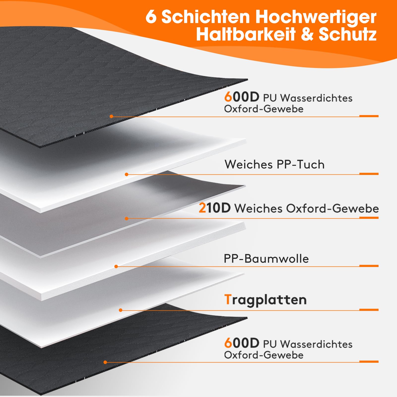 - Hochwertige Materialien: Gefertigt aus robustem 600D Oxford-Gewebe, weicher PP-Baumwolle und einer wasserdichten PVC-Beschichtung.