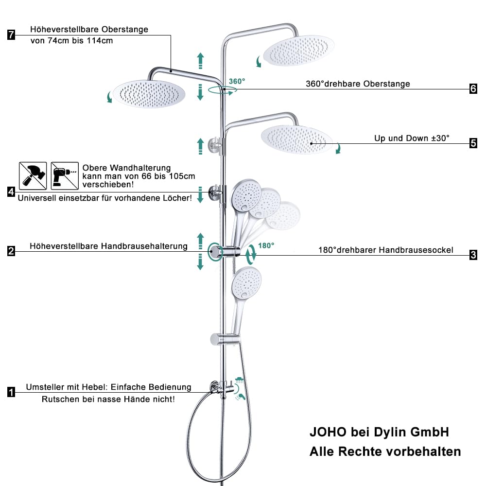 Dank der durchdachten Konstruktion lässt sich dieses Duschsystem mühelos in fast jedes Badezimmer integrieren. Die höhenverstellbare und schwenkbare Duschstange sowie die flexible Wandhalterung ermöglichen eine Anpassung an Ihre individuellen Bedürfnisse und die Gegebenheiten vor Ort, was es zur perfekten Wahl für Renovationen macht.