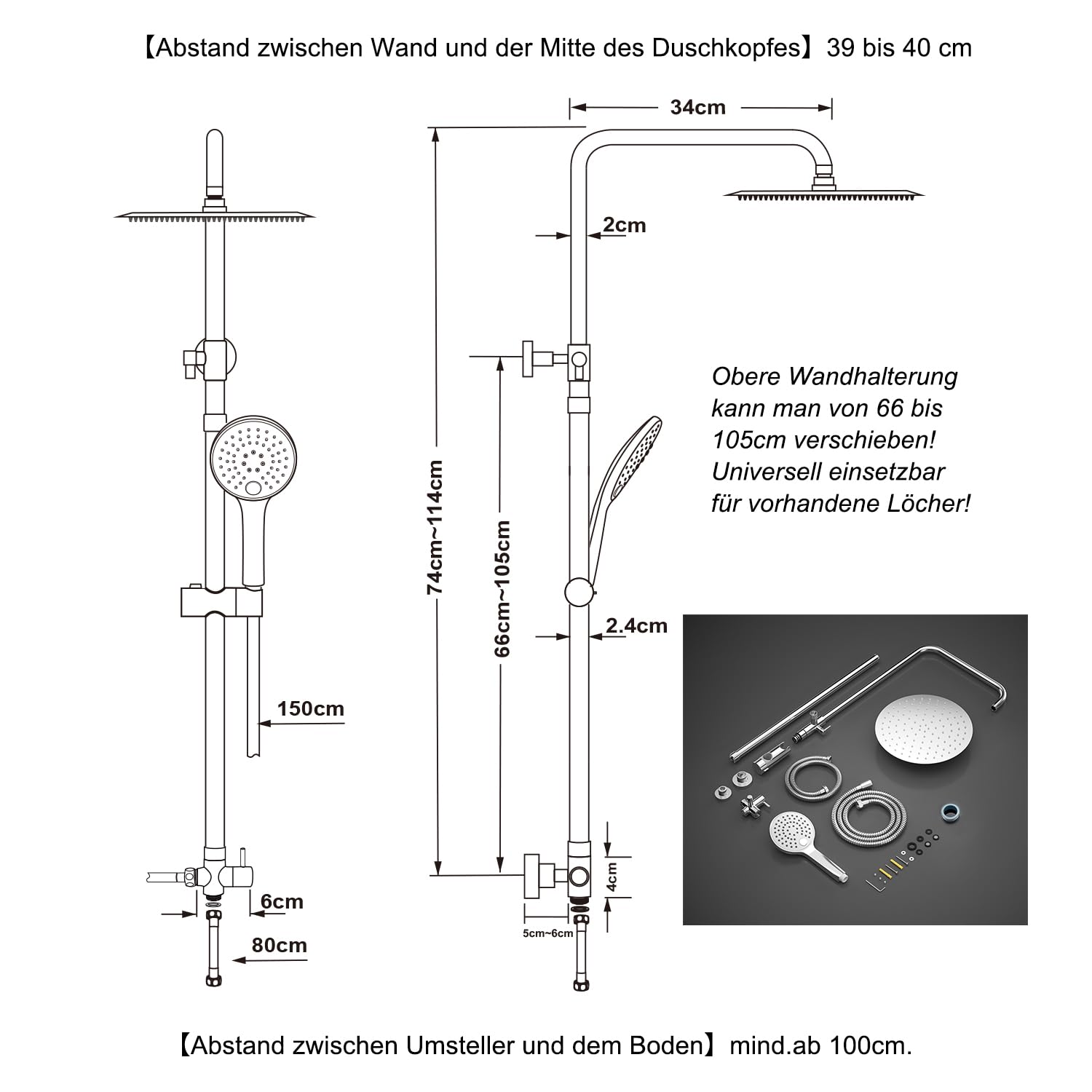 - Abmessungen: Der Abstand von der Wand bis zur Mitte des Regenduschkopfes beträgt ca. 39-40 cm.
