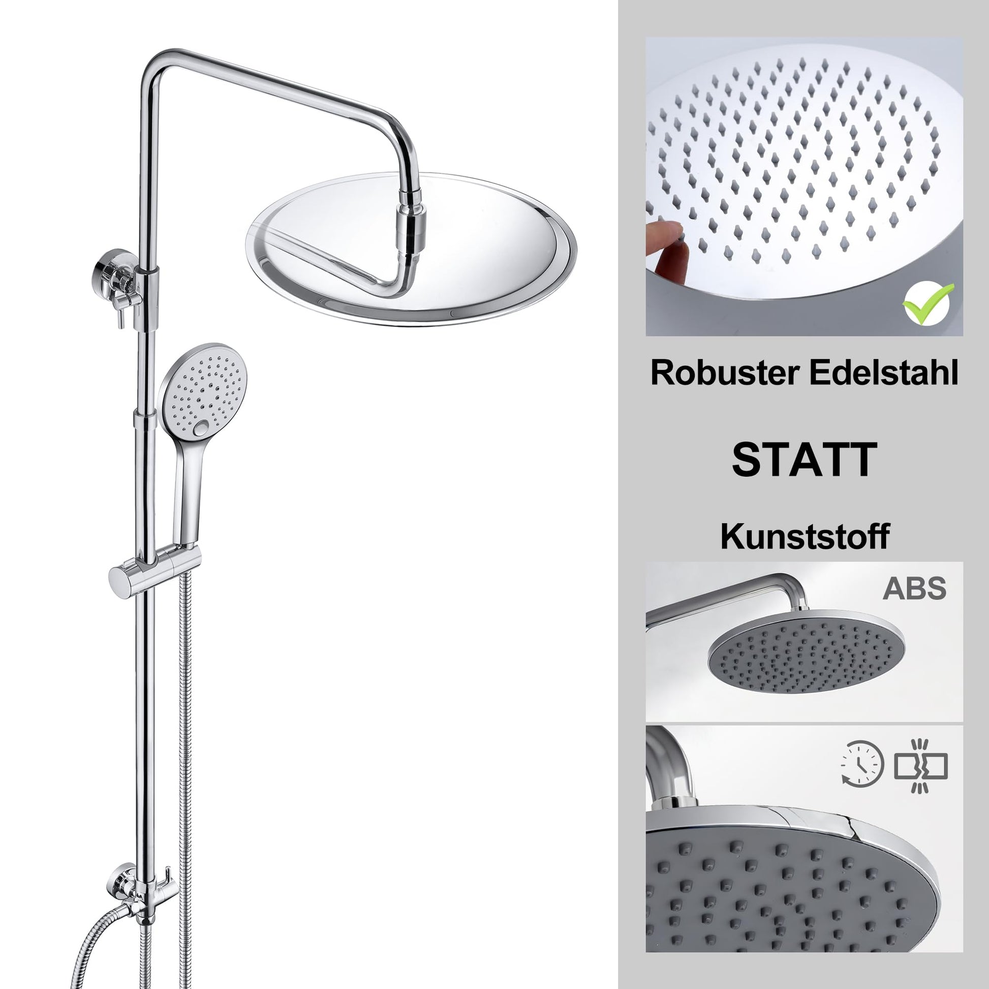Das Duschset ist auf Langlebigkeit ausgelegt und besteht aus hochwertigem Edelstahl (Regenduschkopf, Duschstange, Schläuche) und massivem Messing (Umsteller). Die Düsen an beiden Brausen sind mit einer Anti-Kalk-Funktion ausgestattet. Für die Reinigung genügt es meist, mit den Fingern oder einem Tuch über die Silikonnoppen zu reiben, um Kalkablagerungen leicht zu entfernen.
