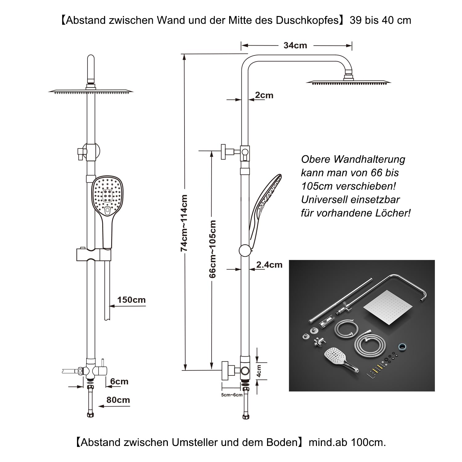 - Abmessungen: Der Abstand von der Wand bis zur Mitte der Kopfbrause beträgt ca. 39-40 cm.
