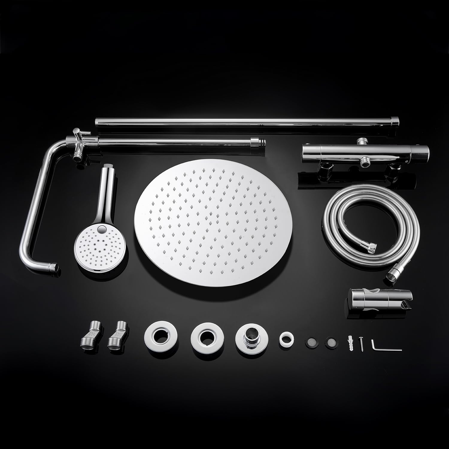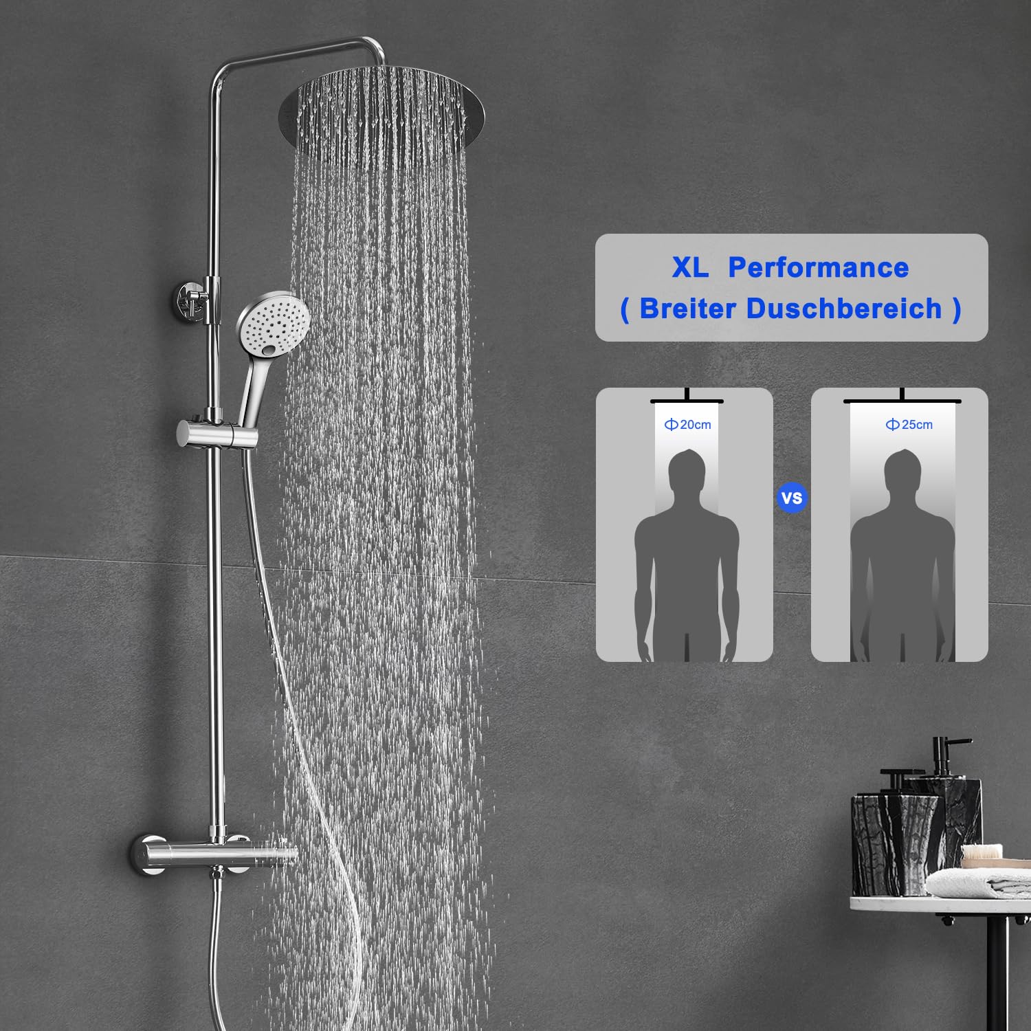 Das gesamte Set besteht aus hochwertigem, rostfreiem 304 Edelstahl mit einer glanzverchromten Oberfläche. Dieses Material ist langlebig und kratzfest. Die XL-Kopfbrause verfügt zudem über Anti-Kalk-Düsen, die die Reinigung erheblich erleichtern.