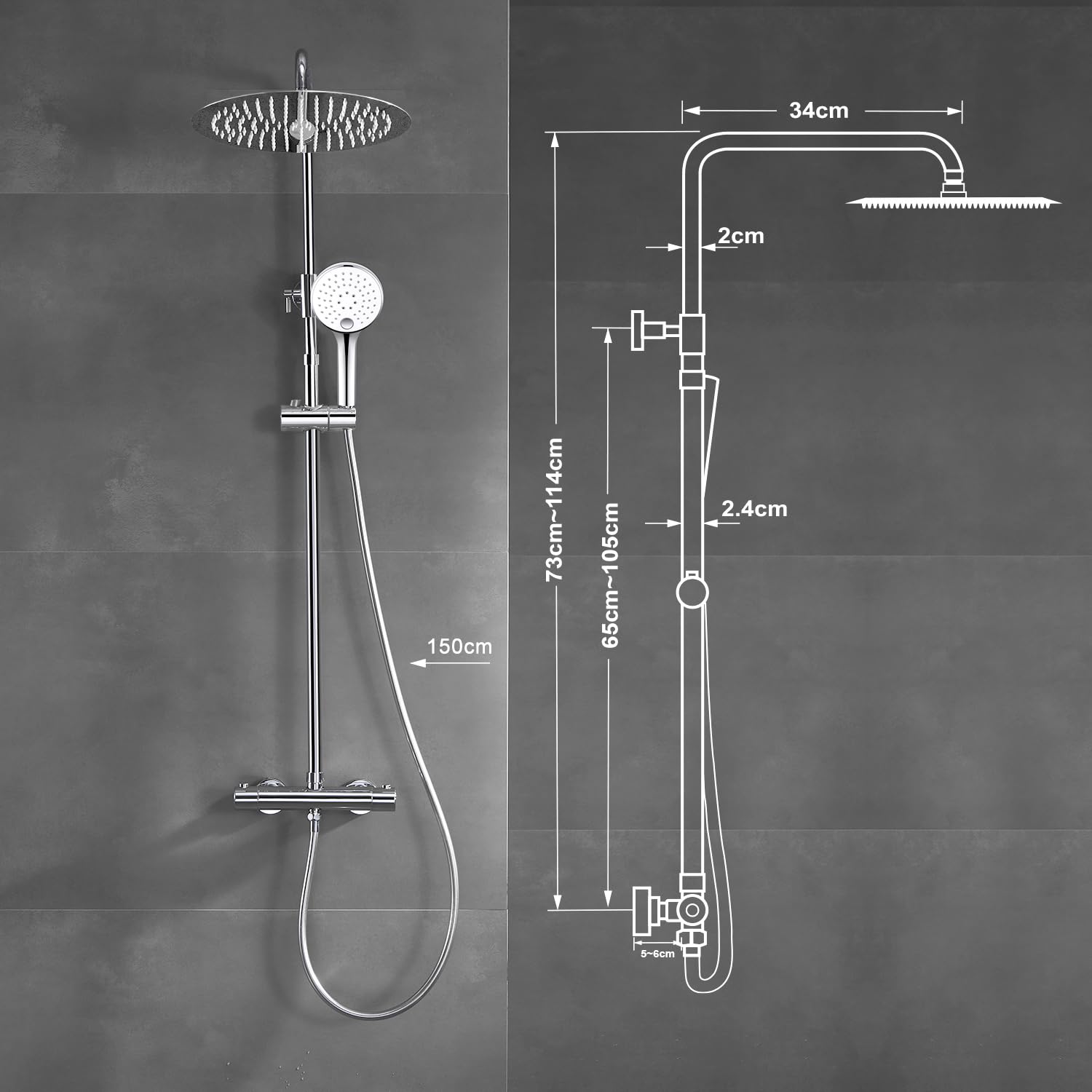 - Flexible Duschstange: Die Höhe der Edelstahlstange ist stufenlos von 74 cm bis 114 cm einstellbar. Die obere Stange ist zudem 360° schwenkbar, ideal für Bäder mit begrenztem Platz.