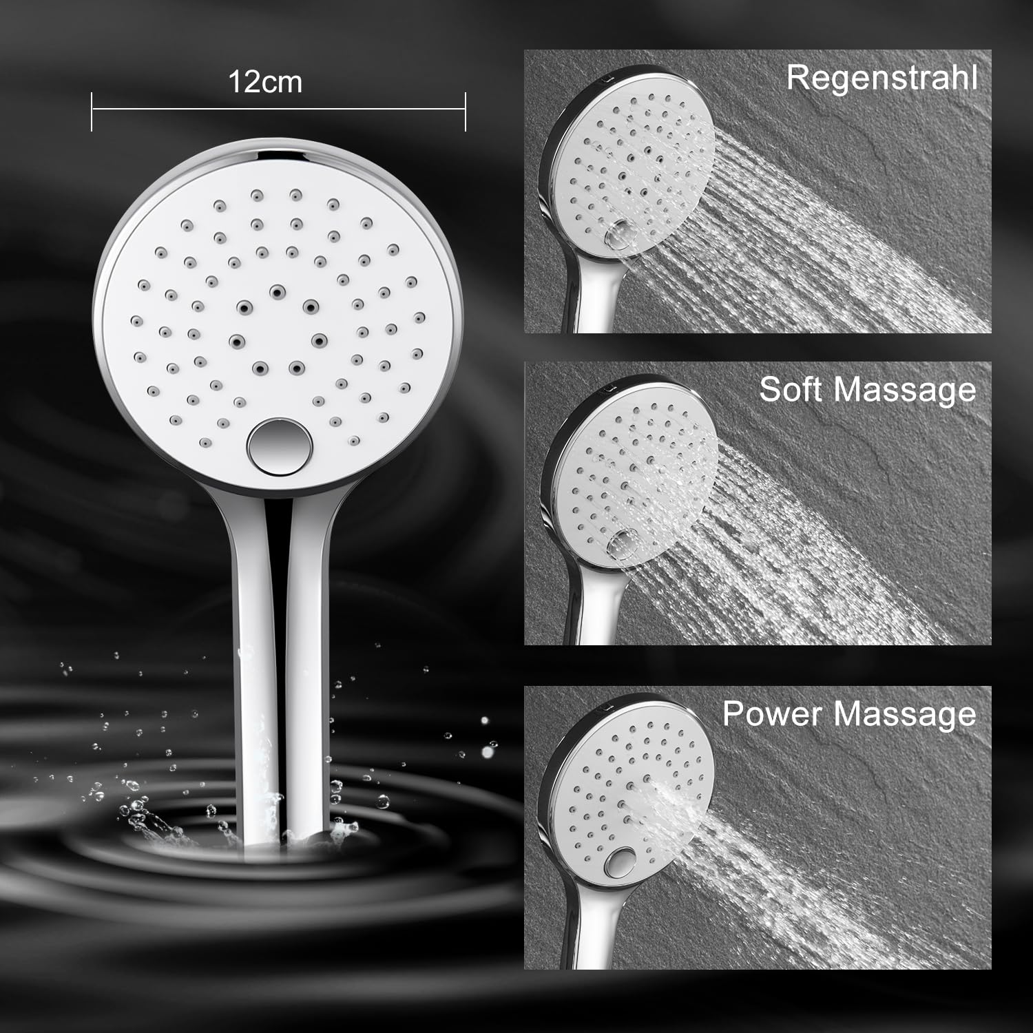 - Handbrause mit 3 Strahlarten: Ein grosser Brausekopf (12 cm Durchmesser) ermöglicht den bequemen Wechsel zwischen den Strahlarten Regen, Soft-Massage und Power-Massage per Knopfdruck.