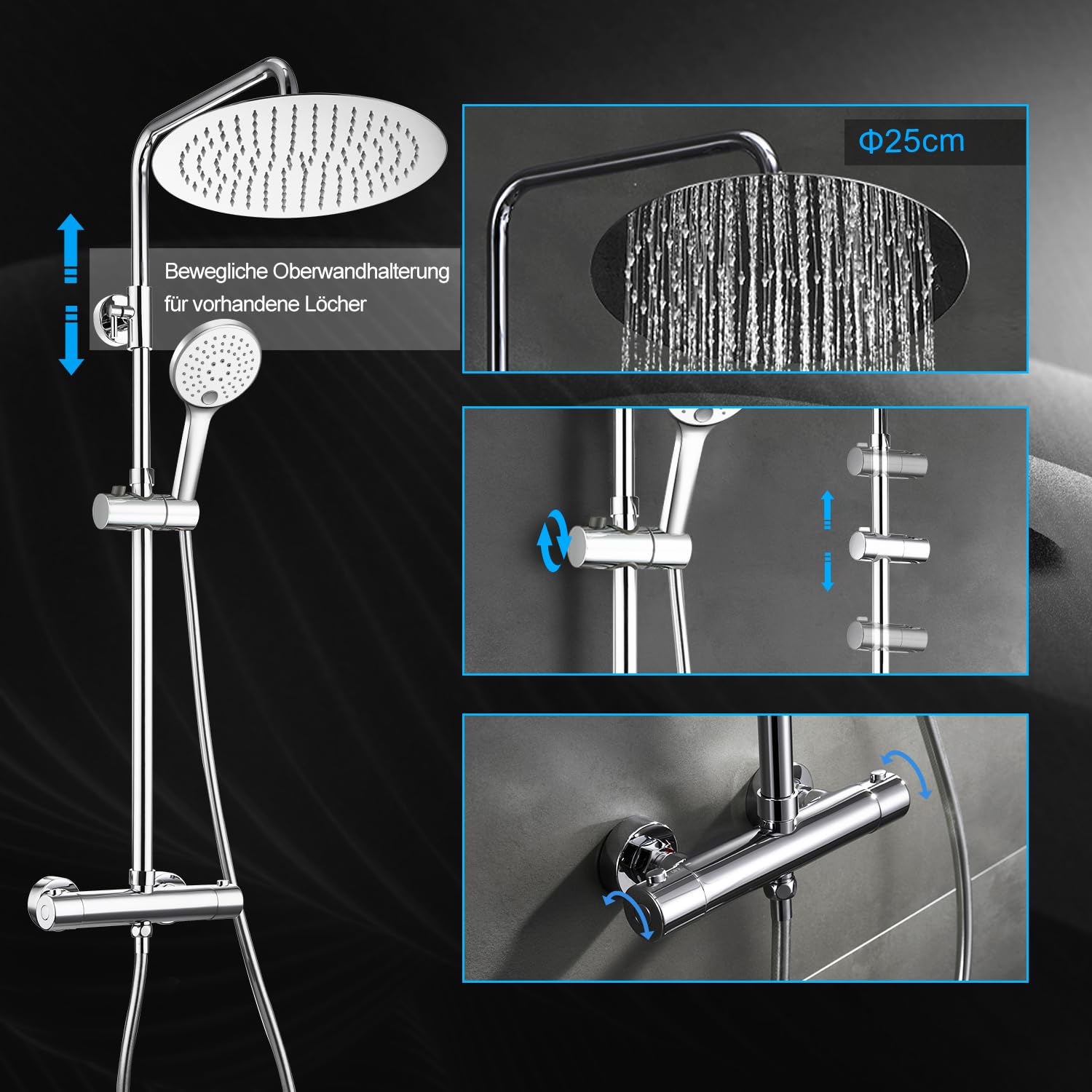 JOHO Regendusche Duschsystem Thermostat – Edelstahl Chrom D25cm