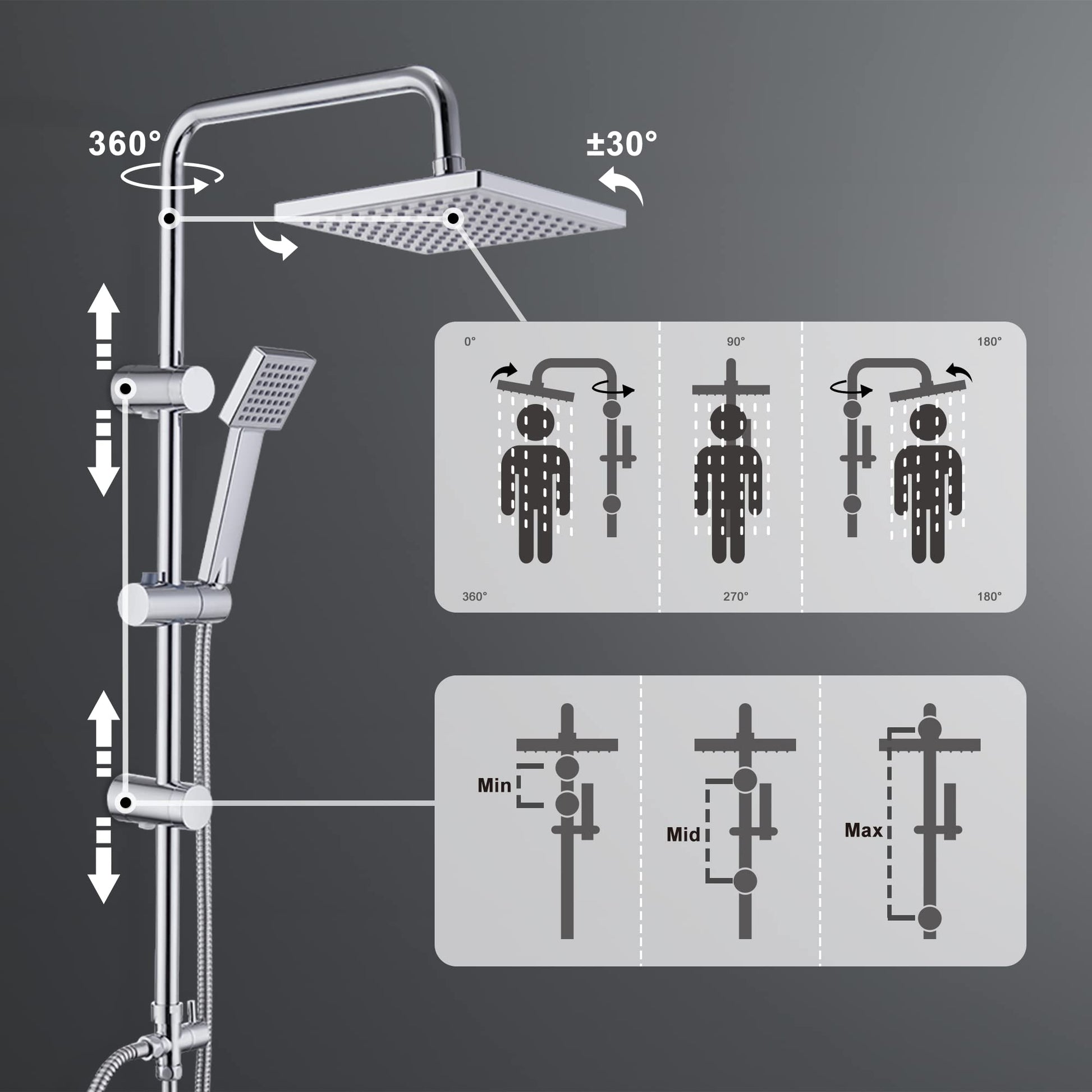 Die Kopfbrause bietet mit einer Grösse von 20 x 20 cm ein grossflächiges Regenduscherlebnis. Ja, der Halter für die Handbrause ist an der 92 cm langen Duschstange stufenlos in der Höhe verstellbar, sodass Sie die Position flexibel an die Körpergrösse verschiedener Nutzer anpassen können.