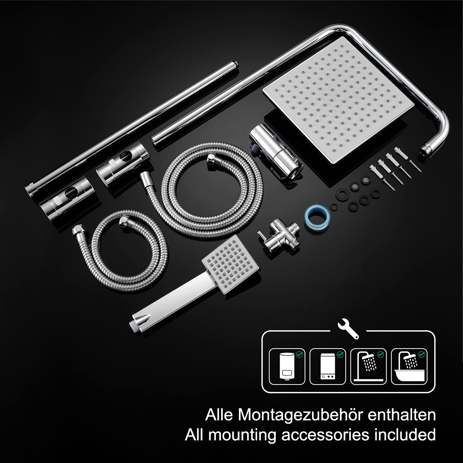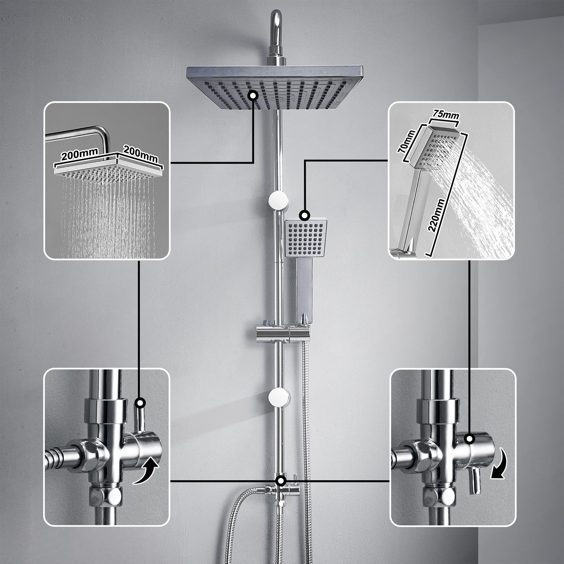 Das Set kombiniert hochwertige Materialien für eine lange Lebensdauer: Die Duschstange und die knicksicheren Schläuche sind aus robustem Edelstahl, der 3-Wege-Umsteller aus massivem Messing und die 20x20 cm grosse Kopfbrause sowie die Handbrause aus verchromtem ABS-Kunststoff mit pflegeleichten Anti-Kalk-Düsen.