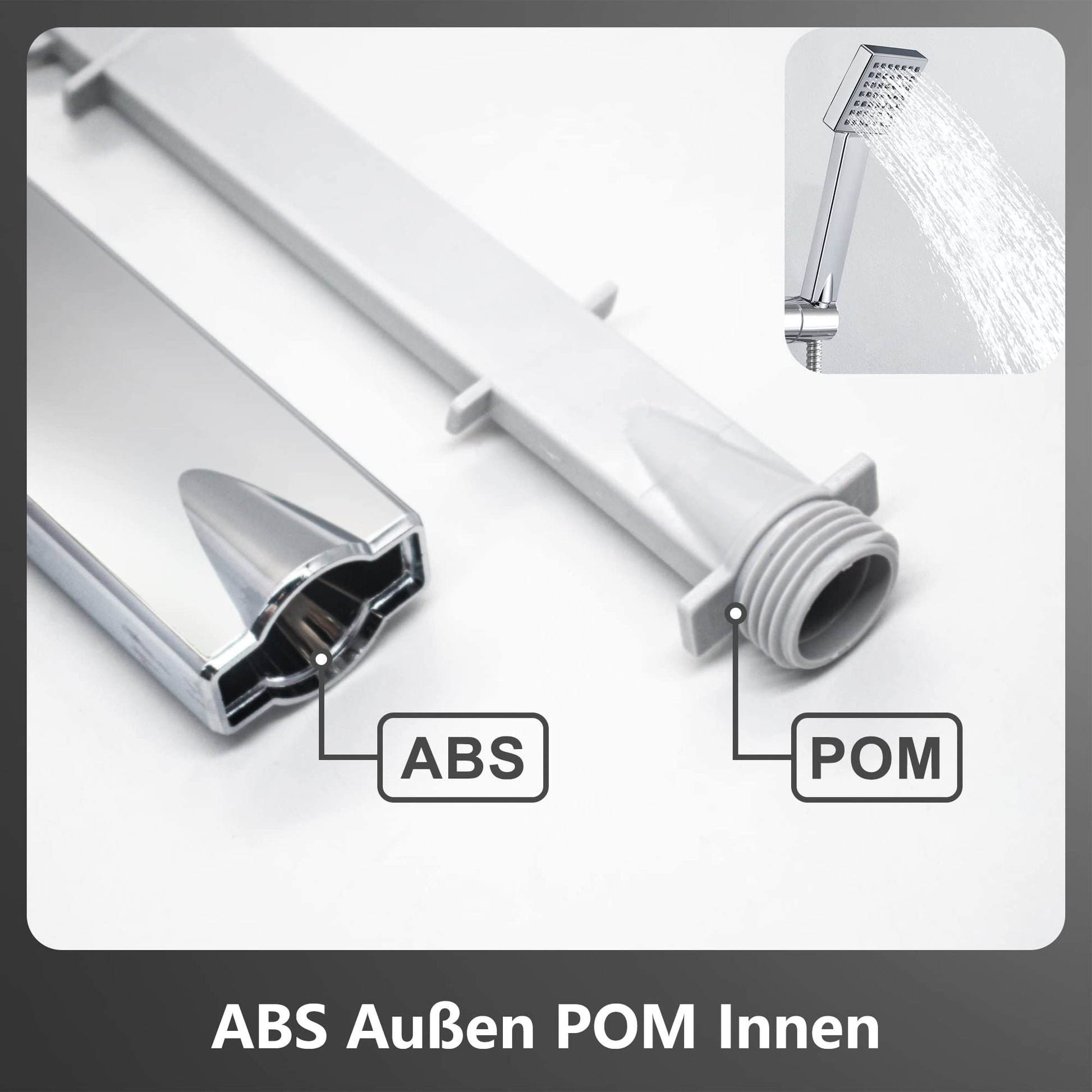 - Materialien: Duschstange/Schläuche (Edelstahl), Kopf-/Handbrause (ABS-Kunststoff), Umsteller (Messing)