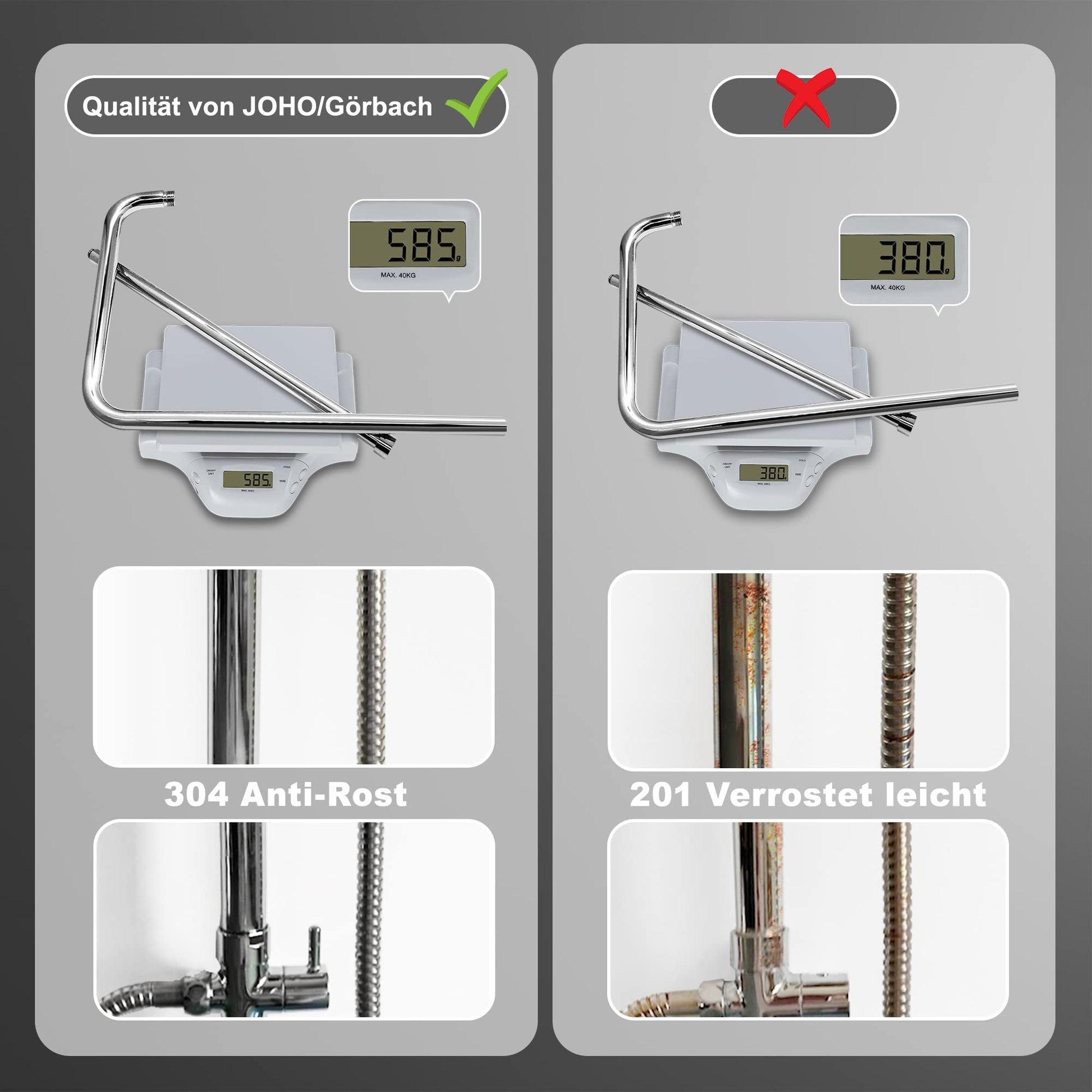 - Flexible Schläuche: Die Edelstahlschläuche (150 cm zur Handbrause, 80 cm zur Armatur) sind dank ihres Designs knick- und verdrehsicher.