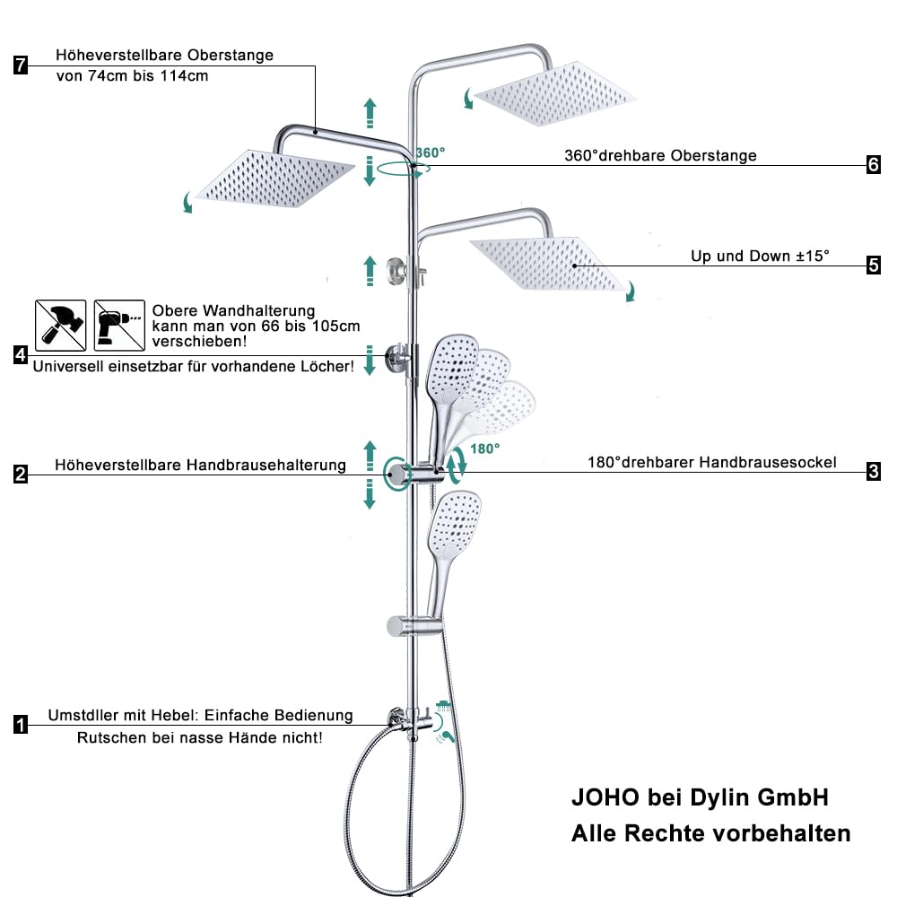 - Flexible Duschstange: Die Stange aus rostfreiem 304 Edelstahl ist von 74 cm bis 114 cm in der Höhe verstellbar. Der obere Teil kann zudem um 360° gedreht werden, ideal auch für kleinere Duschkabinen.