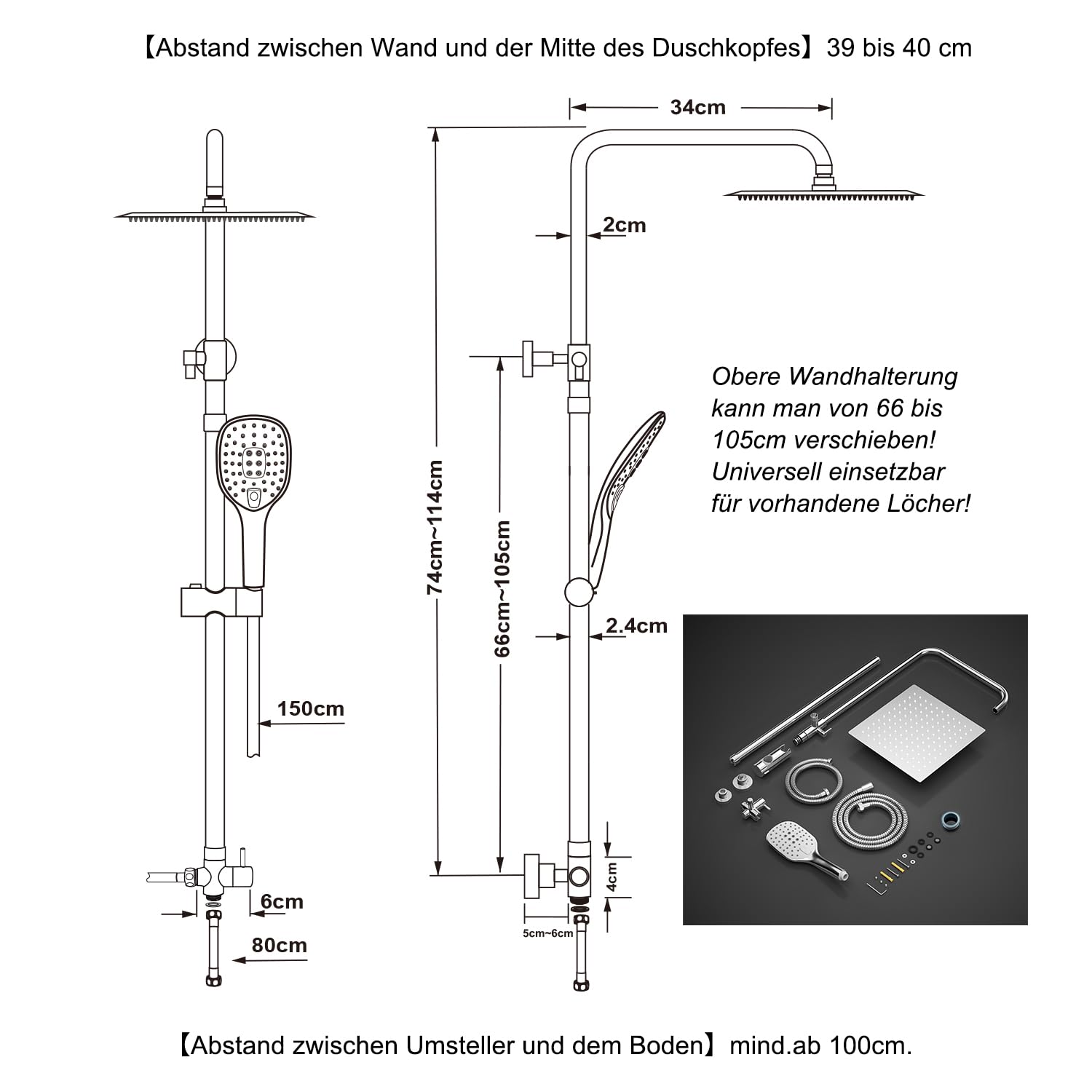 - Abstand Wand bis Mitte Duschkopf: ca. 39-40 cm