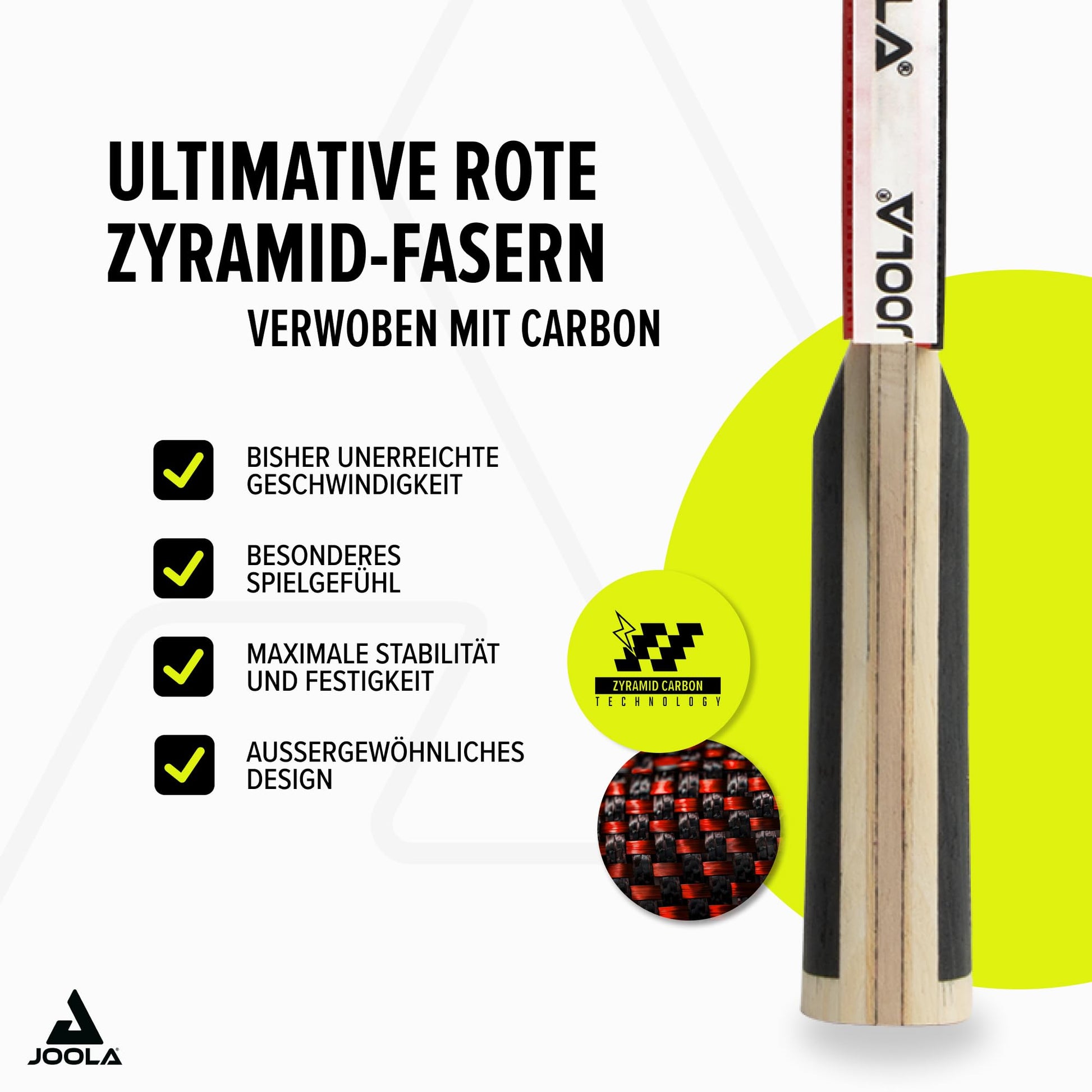 Die eingearbeitete ZYRAMID-Carbonfaser verleiht dem Schläger maximale Geschwindigkeit und Präzision. Sie ermöglicht ein druckvolles und explosives Angriffsspiel, ideal für schnelle Topspins und Schüsse.