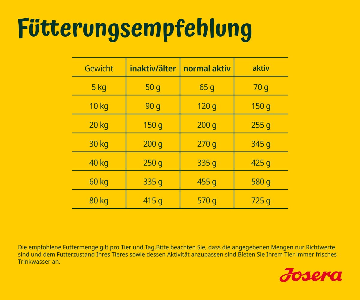 Die empfohlene Futtermenge richtet sich nach dem Aktivitätslevel und Gewicht Ihres Hundes. Genaue Angaben finden Sie auf der Rückseite der Verpackung. Sorgen Sie bitte dafür, dass Ihrem Vierbeiner stets genügend frisches Trinkwasser zur Verfügung steht.
