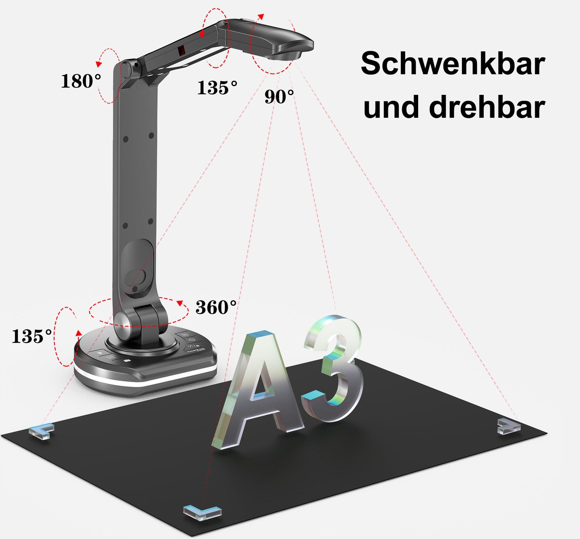 Sie ist äusserst flexibel. Der Arm mit vier Gelenken und der um 270 Grad drehbare Kamerakopf ermöglichen die perfekte Ausrichtung auf Objekte jeder Grösse, von einer kleinen Münze bis hin zu Dokumenten im A3-Format. Eine passende A3-Matte ist im Lieferumfang enthalten.