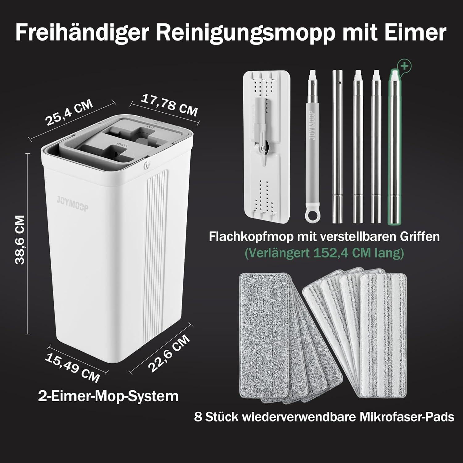 JOYMOOP Wischmopp & Eimer Set mit Auswringer – Flach, 8 Pads