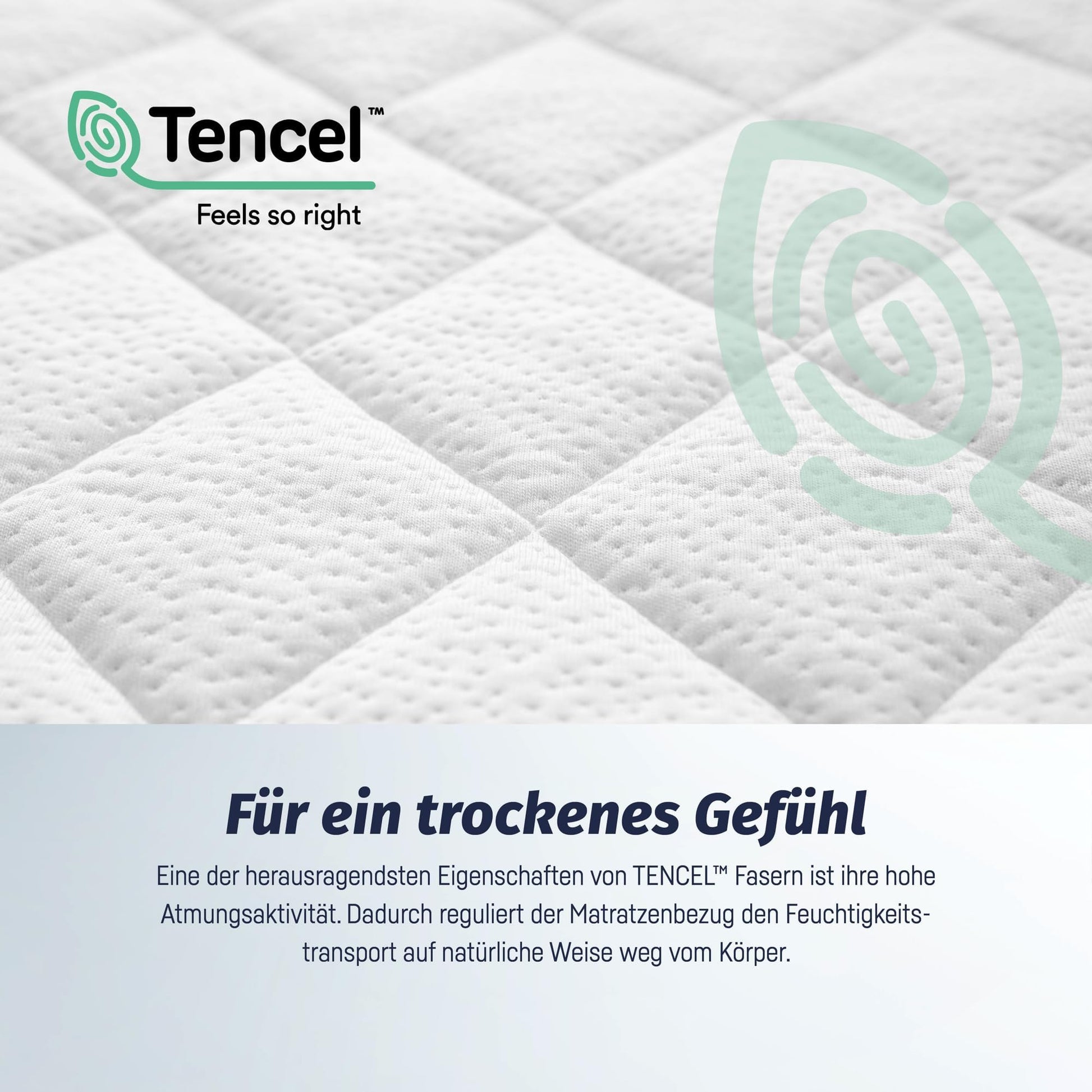 - Atmungsaktiver Funktionsbezug: Der Bezug aus Tencel™ Naturfasern verfügt über einen integrierten Nässeschutz, ist hochgradig atmungsaktiv und kann hygienisch bei 60°C gewaschen werden.