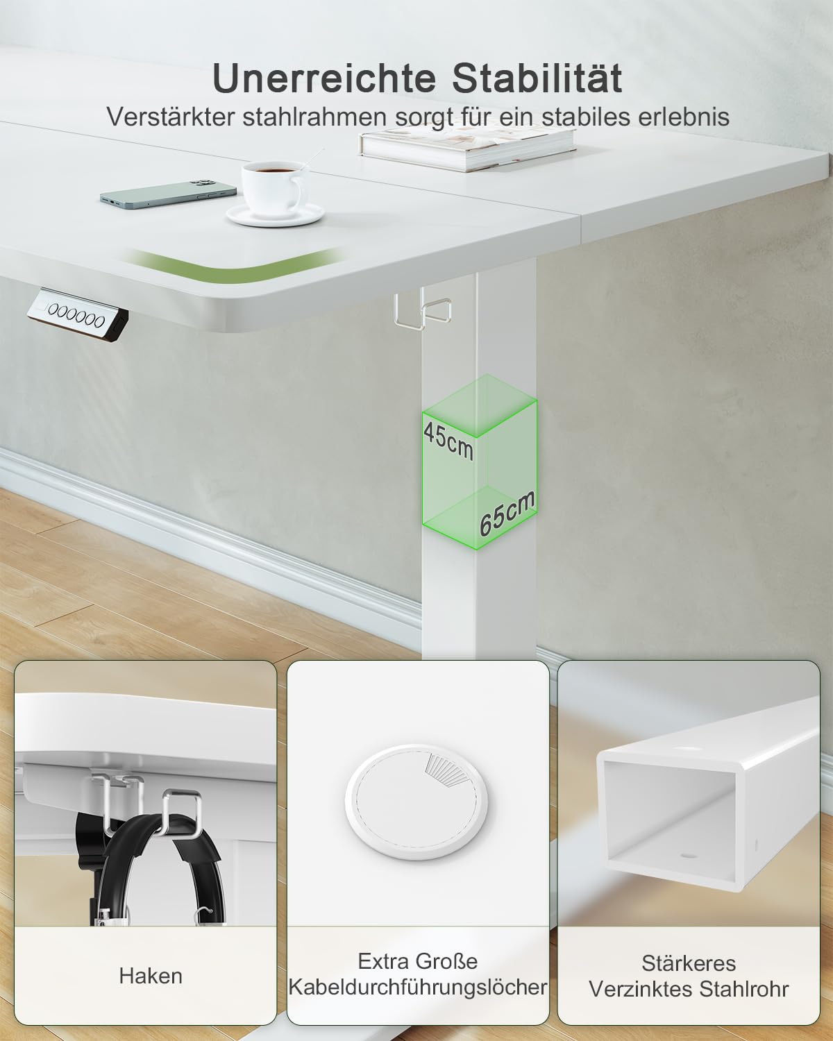 Ein robuster Stahlrahmen mit breiten, T-förmigen Beinen sorgt für maximale Stabilität und eine wackelfreie Arbeitsfläche, die in über 10.000 Zyklen getestet wurde. Die empfohlene maximale Belastbarkeit für den Schreibtisch beträgt 80 kg.