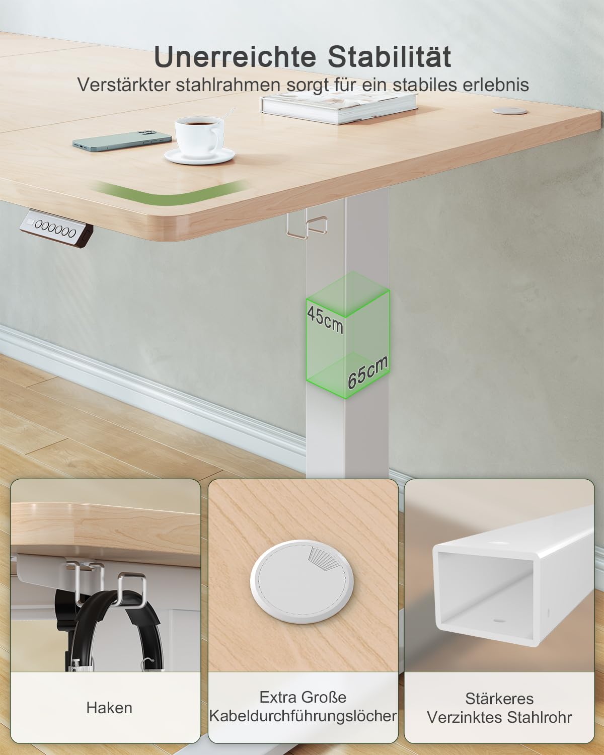 Der Tisch bietet durchdachte Extras für einen aufgeräumten Arbeitsplatz: einen integrierten USB-Ladeanschluss, einen praktischen Haken für Kopfhörer oder Taschen sowie einen Kabel-Hub zur Organisation Ihrer Kabel. Zudem sorgt ein Antikollisionssystem für zusätzliche Sicherheit.