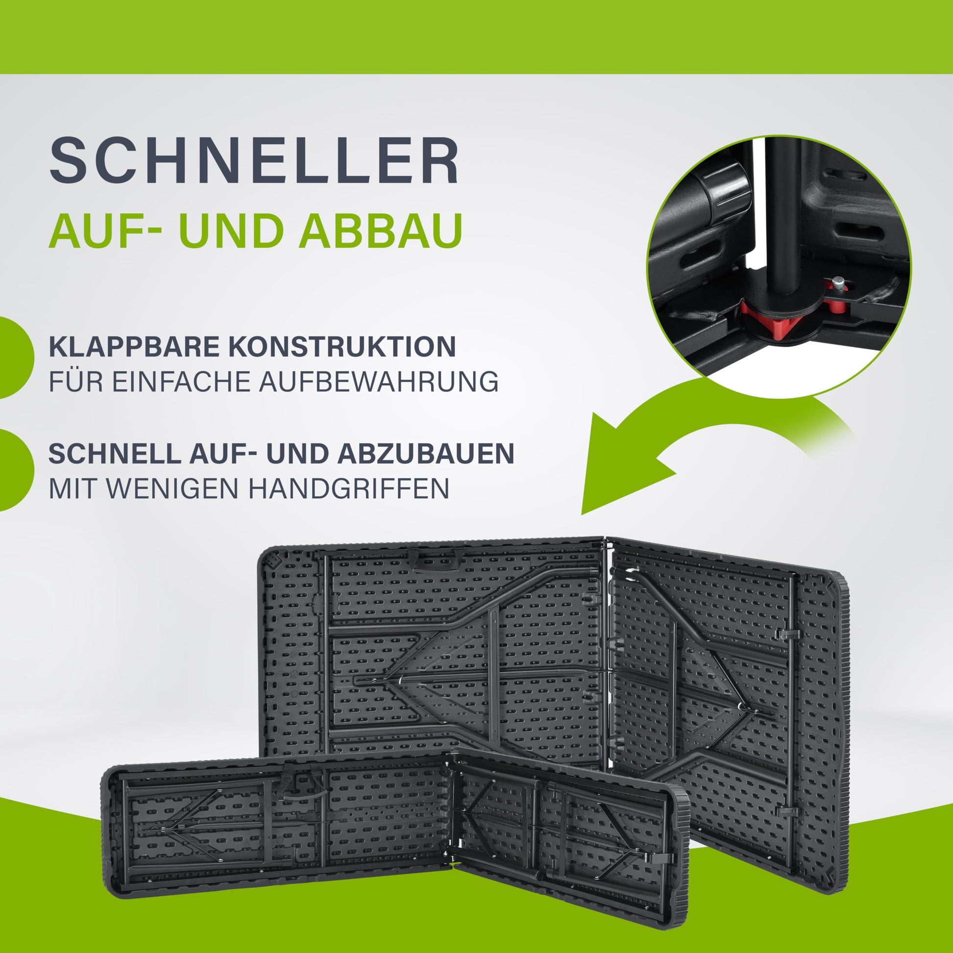 - Mobile Kofferfunktion: Tisch und Bänke lassen sich für einen einfachen Transport kompakt zusammenklappen und dank seitlicher Griffe mühelos tragen.