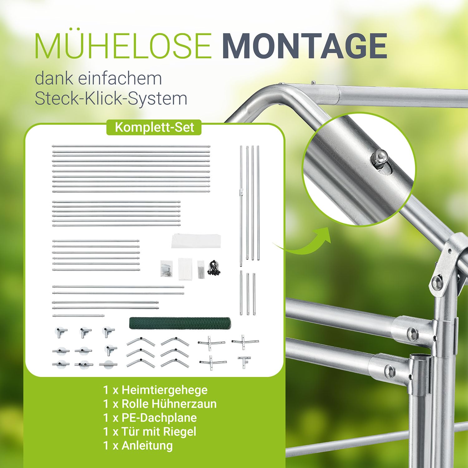 Der Aufbau gestaltet sich dank des intelligenten Steck-Klick-Systems sehr einfach und ist schnell erledigt. Das Komplettset enthält alles, was Sie benötigen: den Bausatz für den Rahmen, eine Rolle Hühnerzaun, die wetterfeste PE-Dachplane mit Spanngummis, eine Tür mit Riegel, Bodennägel zur Verankerung und eine Aufbauanleitung.