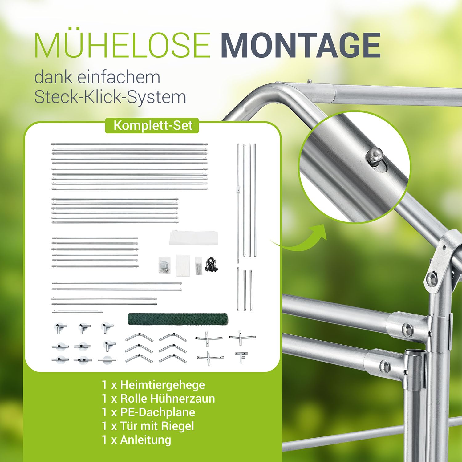 Der Aufbau gestaltet sich dank der federbelasteten Steck-Klick-Verbindungen schnell und unkompliziert. Für einen stabilen und sicheren Stand wird das Gehege mit den mitgelieferten Bodennägeln im Untergrund verankert. Auch die Regenplane lässt sich flexibel und straff mit Spanngummis an den Ösen befestigen.