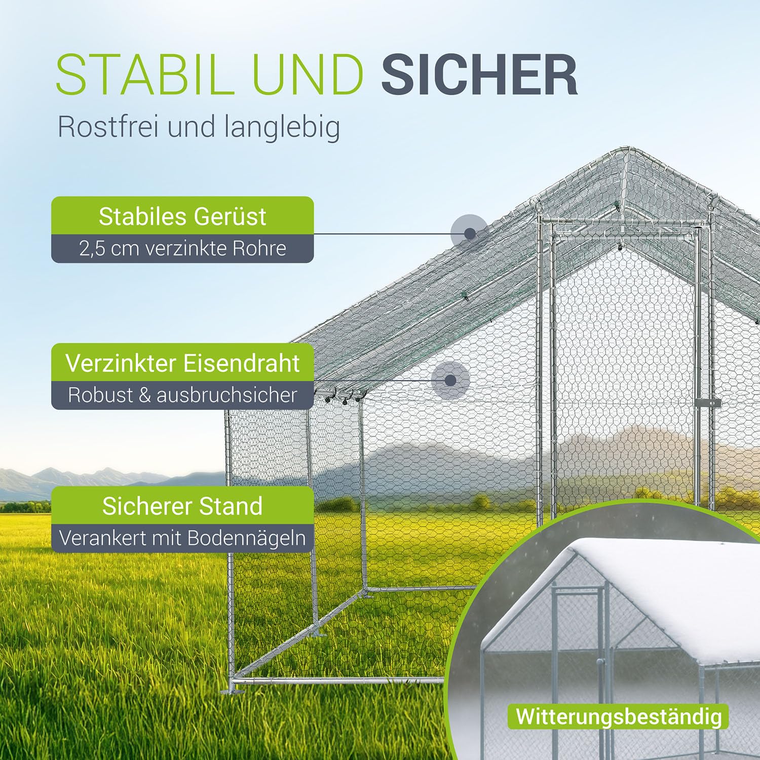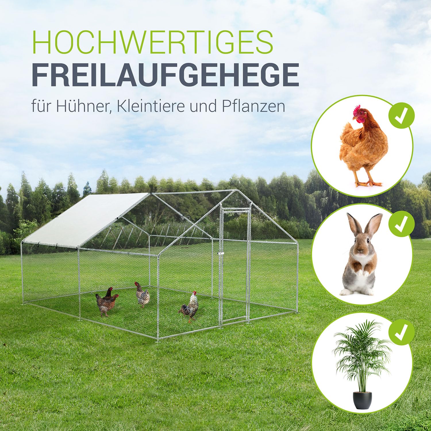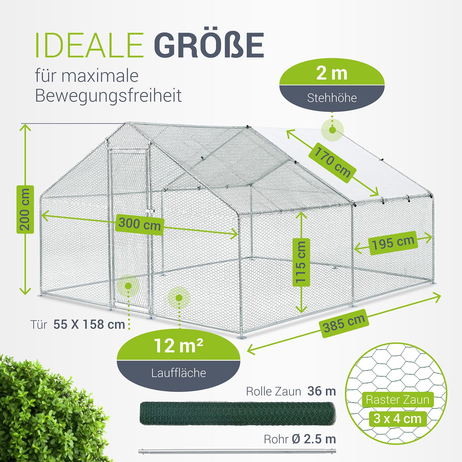 Dieses geräumige Freilaufgehege bietet auf einer grosszügigen Fläche von 12 Quadratmetern einen sicheren und geschützten Aussenbereich für Ihre Hühner, Gänse und andere Kleintiere. Es lässt sich ebenso vielseitig als stabiler Schutz für empfindliche Pflanzen einsetzen.