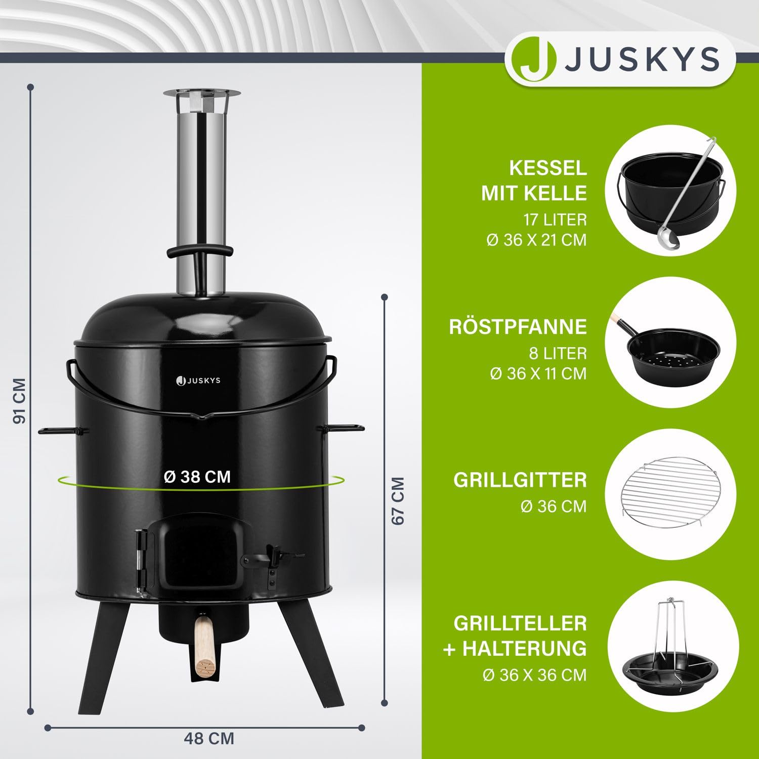 Das Komplettset beinhaltet den Ofenkorpus mit Aschebehälter und Füssen, einen 17-Liter-Gulaschkessel, eine 8-Liter-Pfanne, einen passenden Deckel, einen Grillrost, einen Einsatz zum Backen von Geflügel sowie eine praktische Schöpfkelle.