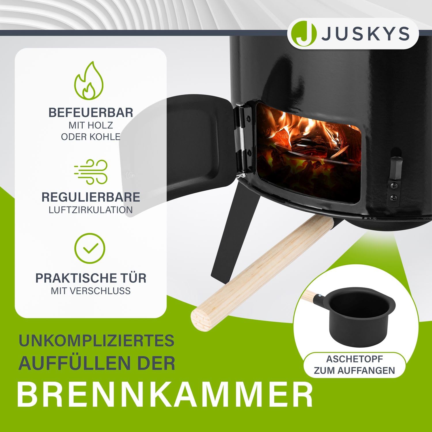- Leistungsstarker Betrieb: Der Ofen erreicht schnell hohe Temperaturen und verfügt über einen praktischen Aschebehälter mit Holzgriff. Zum Lieferumfang gehören Deckel, Grillrost und eine Schöpfkelle.