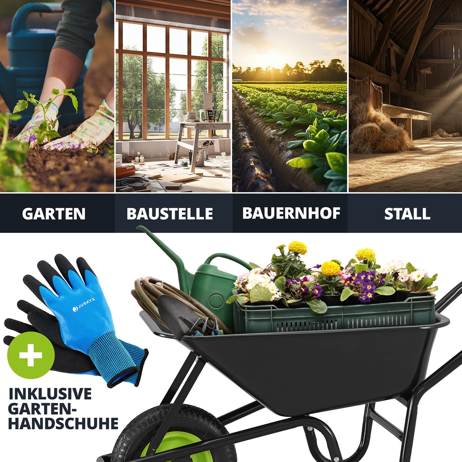 Die durchdachte Konstruktion mit langen Griffholmen erleichtert das Anheben und Auskippen von schweren Materialien erheblich. So transportieren Sie alles von Laub bis zu Baumaterialien kraftsparend und effizient. Für den sofortigen Einsatz liegt ein Paar passende Arbeitshandschuhe bei.