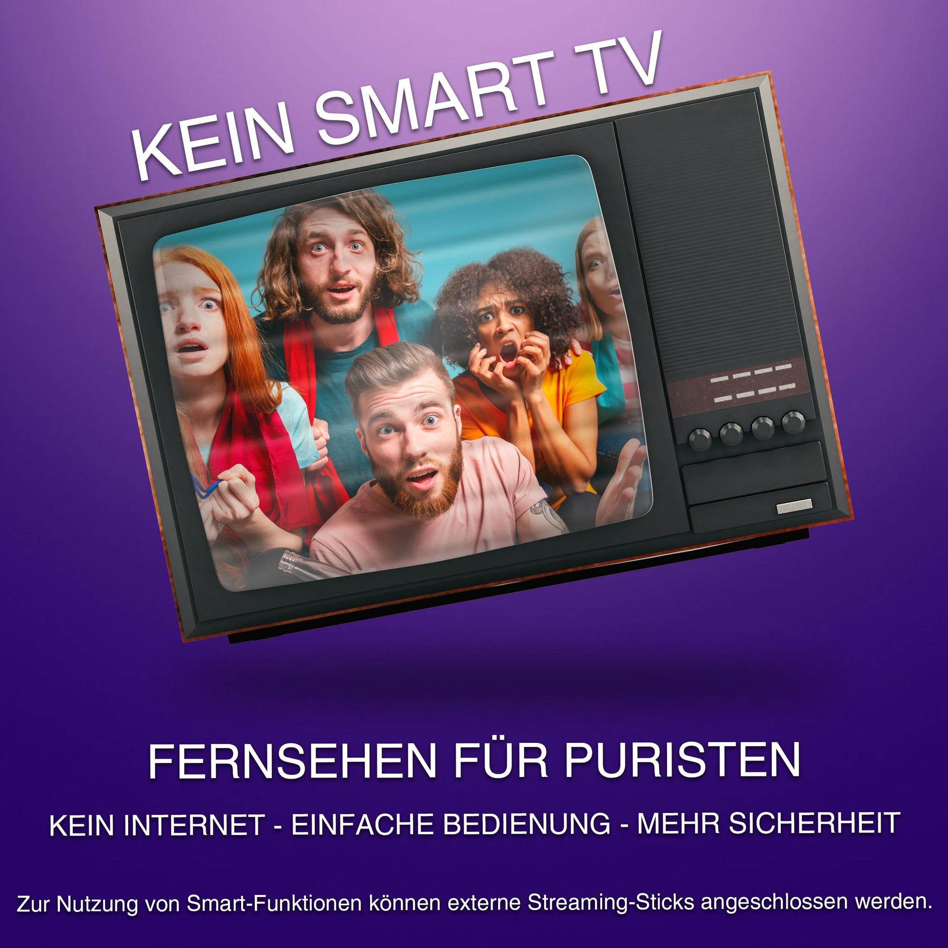 Nein, dieses Modell ist ein klassischer Fernseher ohne Smart-TV-Funktionen, WLAN oder Apps. Er konzentriert sich auf ein unkompliziertes Fernseherlebnis und die Medienwiedergabe über externe Geräte.