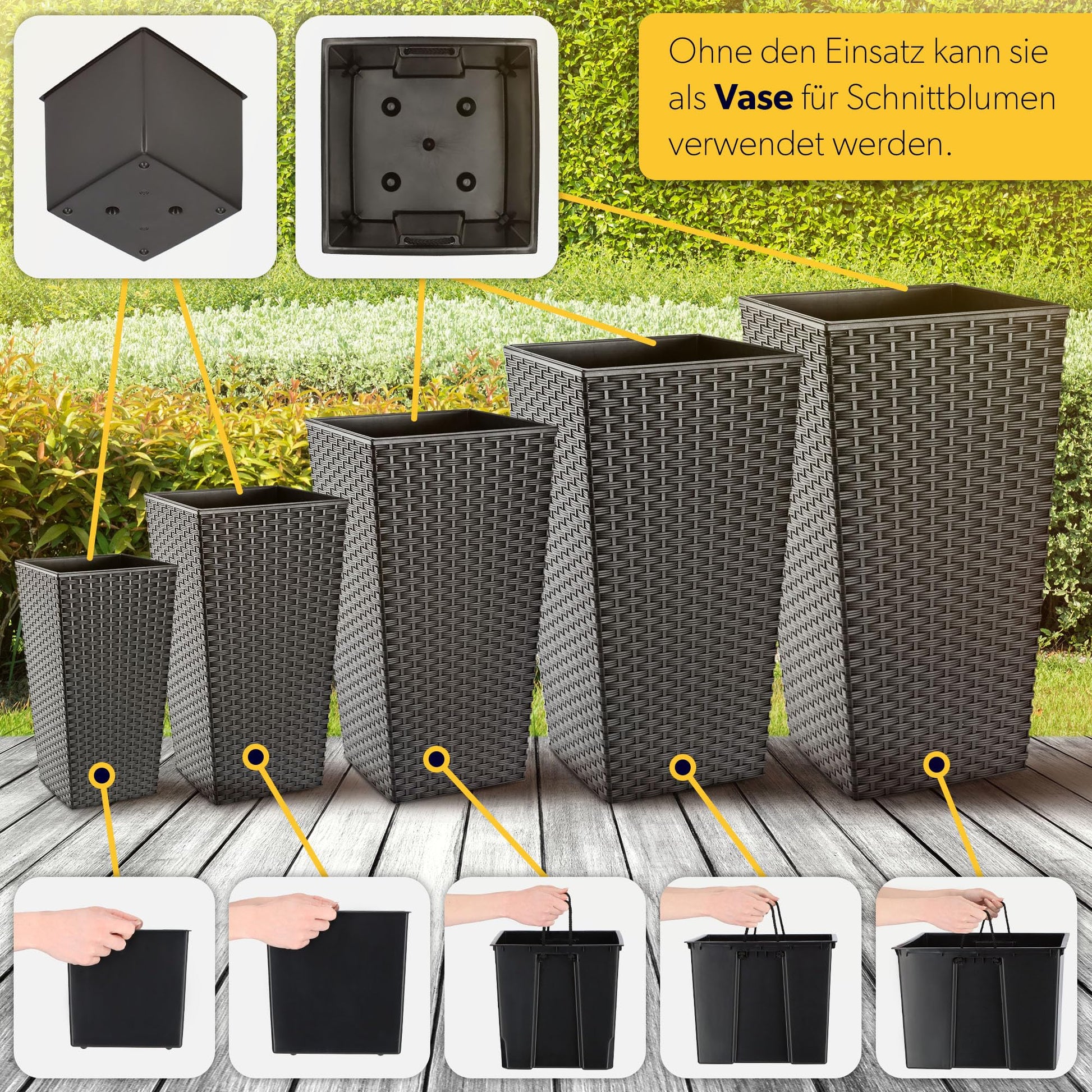 KADAX 3er Set Pflanzkübel mit Innentopf – Grafit Rattan H 57-75 cm