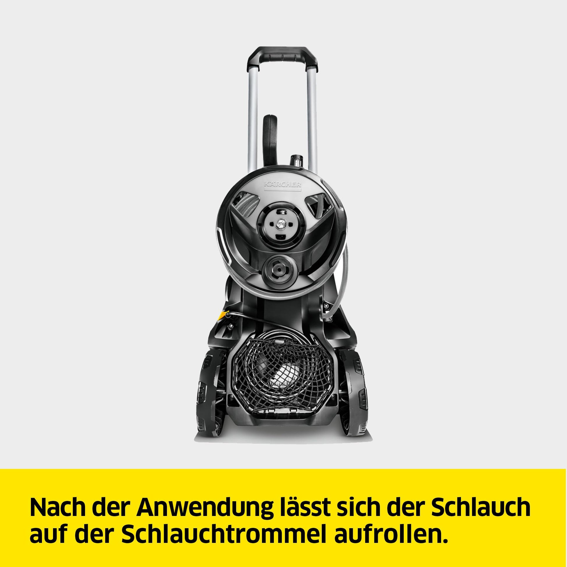 Die Handhabung ist sehr komfortabel. Der 10 Meter lange Flex-Hochdruckschlauch lässt sich dank der integrierten Schlauchtrommel nach Gebrauch einfach und knickfrei aufwickeln. Zubehörteile wie die Pistole und das Strahlrohr finden direkt am Gerät Platz. Für den einfachen Transport und die platzsparende Lagerung sorgt der ausziehbare Teleskopgriff aus Aluminium.