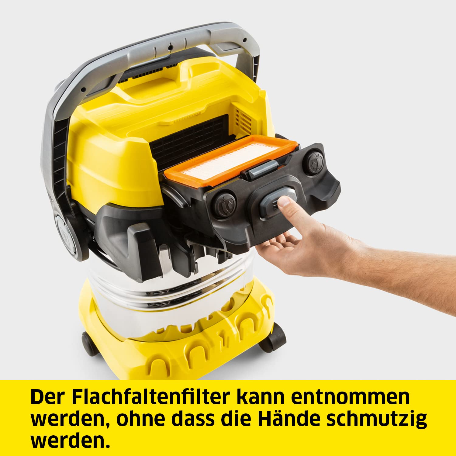 - Nass- und Trockensaugen: Dank des innovativen Flachfaltenfilters können Sie nassen und trockenen Schmutz ohne lästigen Filterwechsel aufsaugen.