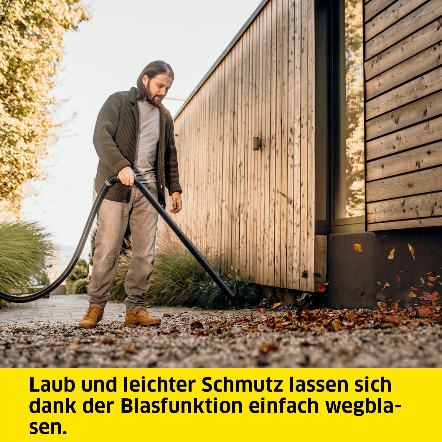 Die Saugfunktion dient dem klassischen Aufsaugen von trockenem Schmutz und Flüssigkeiten in den robusten 25-Liter-Edelstahlbehälter. Die zuschaltbare Blasfunktion kehrt den Luftstrom um und ermöglicht es Ihnen, Laub, Späne oder Schmutz aus schwer zugänglichen Ecken, Fugen oder von empfindlichen Oberflächen zu blasen, wo Saugen nicht möglich oder sinnvoll ist.