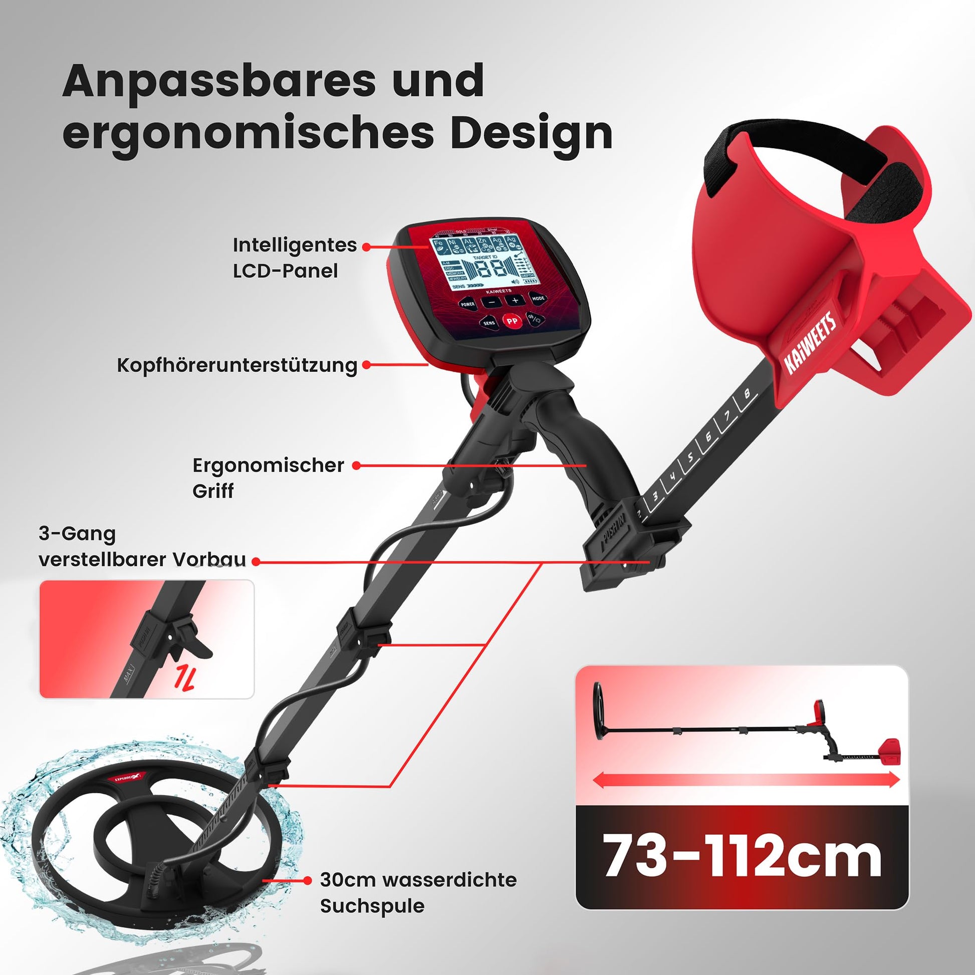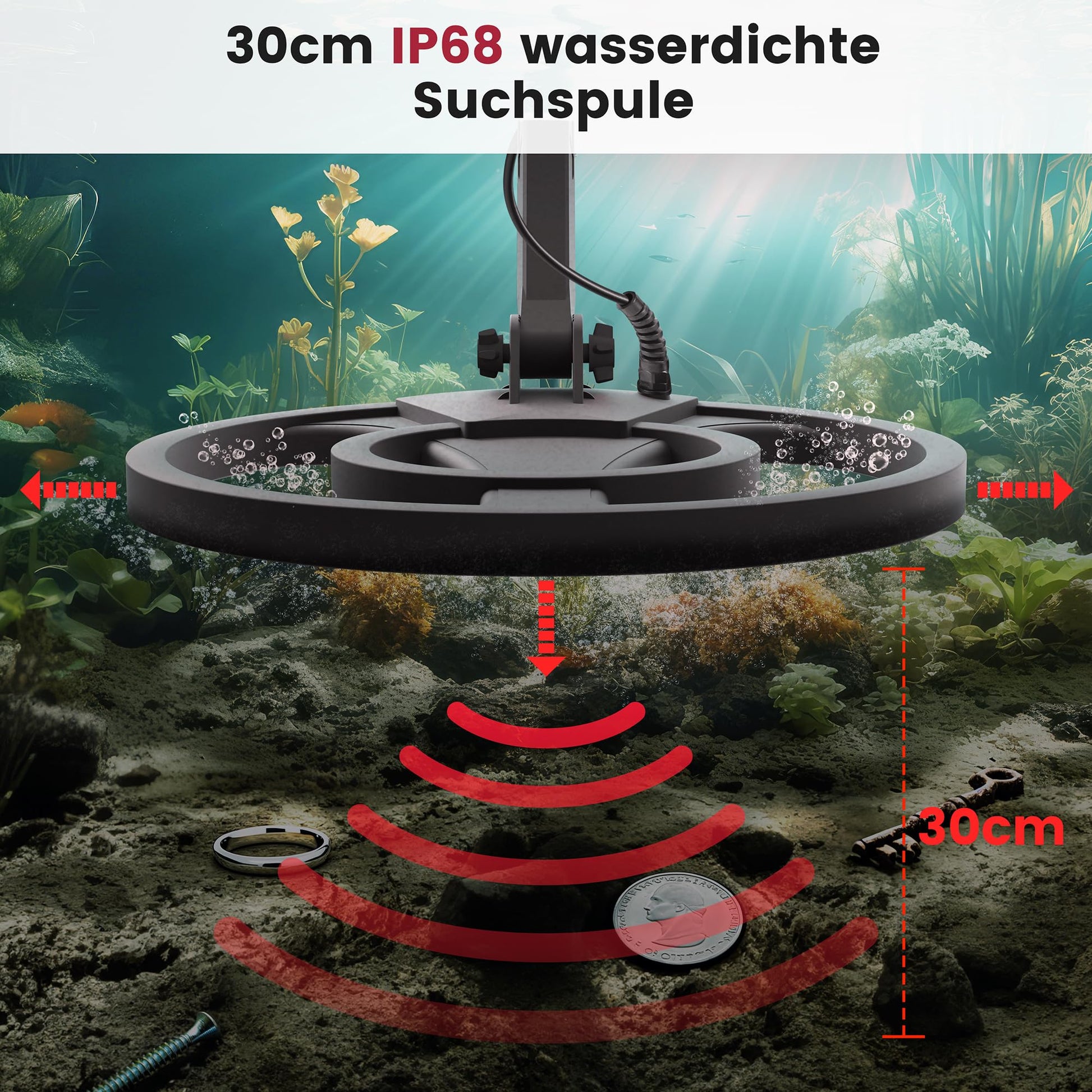 - IP68 wasserdichte Tiefensuchspule: Die hochempfindliche 30-cm-Spule ermöglicht die Suche an Land und im Wasser in einer Tiefe von bis zu 30 cm. Der Schaft ist von 73 cm bis 104 cm verstellbar.