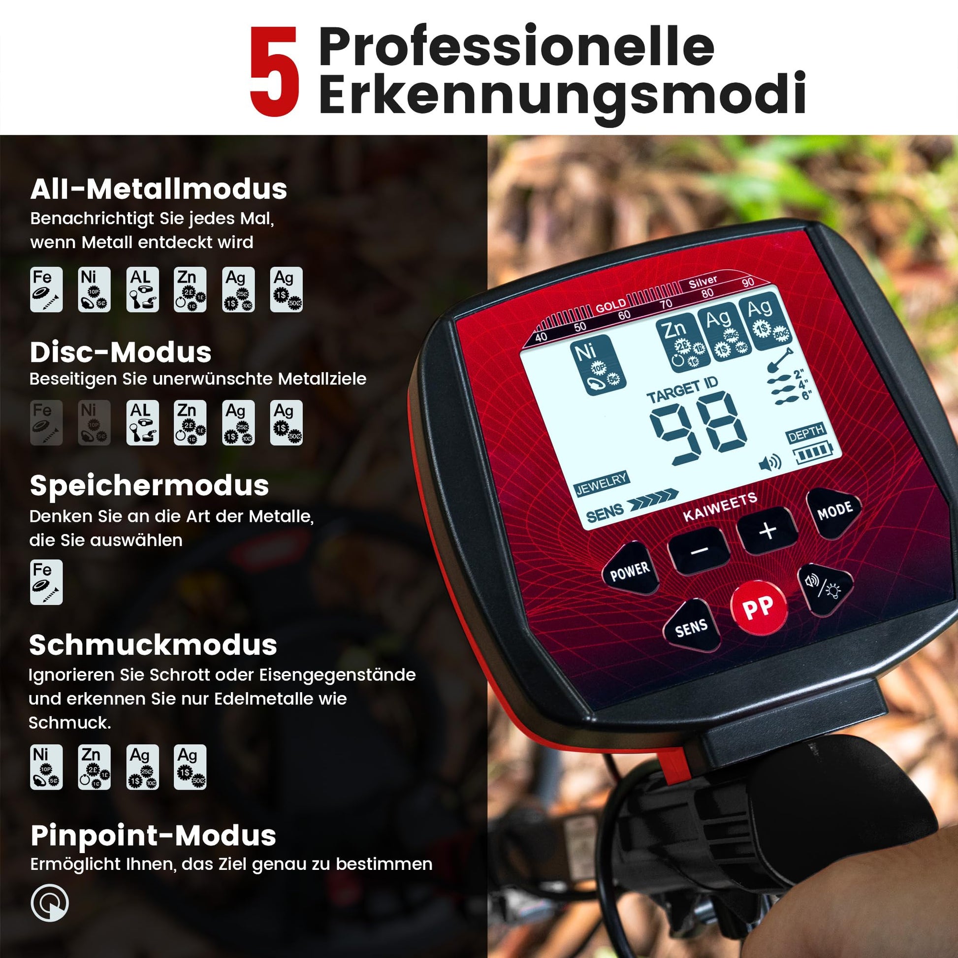- Fünf vielseitige Erkennungsmodi: Wählen Sie zwischen ALL METAL (erkennt alle Metalle), DISC (filtert unerwünschte Objekte), MEMORY (speichert ein Zielmetall), SCHMUCK (fokussiert auf Edelmetalle) und PINPOINTER (für die punktgenaue Lokalisierung).