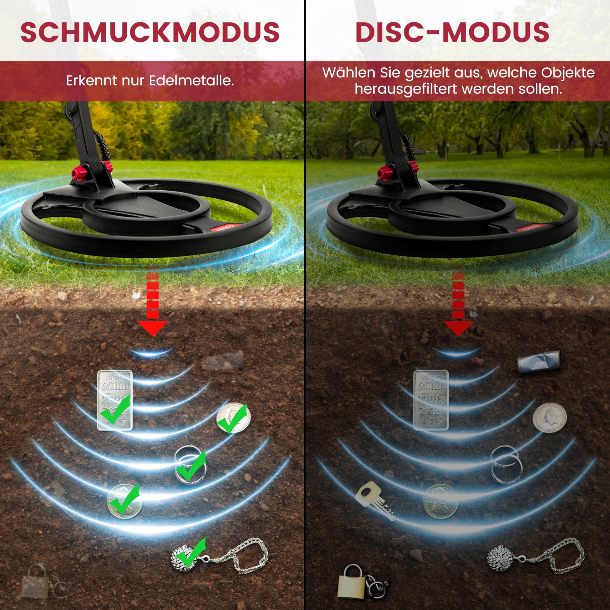 Das Gerät verfügt über fünf verschiedene Erkennungsmodi. Mit dem DISC-Modus können Sie gezielt unerwünschte Metalle wie Eisen herausfiltern. Der SCHMUCK-Modus fokussiert die Suche auf Edelmetalle, wodurch Sie weniger Zeit mit dem Graben nach wertlosen Objekten verbringen.