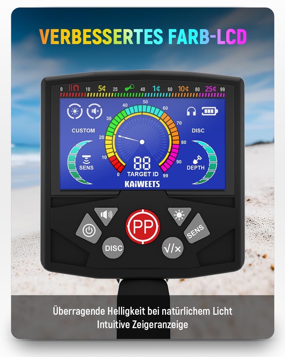 Entdecken Sie verborgene Schätze mit dem KAIWEETS Metalldetektor. Ausgestattet mit moderner Technologie und einem benutzerfreundlichen Design ist dieses Gerät der ideale Begleiter für Abenteurer und Hobby-Archäologen, egal ob gross oder klein.