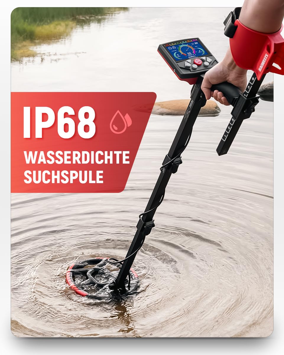 - Wetterfest und flexibel: Die IP68-zertifizierte, wasserfeste Spule ermöglicht die Suche in feuchten Umgebungen, während der verstellbare und klappbare Schaft den Transport vereinfacht.