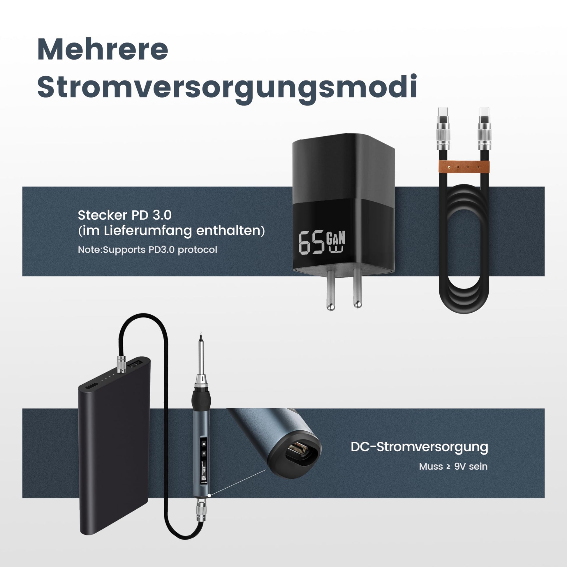 - Lieferumfang: Lötkolben, 65W GaN Ladekopf, 5 Ersatzspitzen, USB-C Kabel