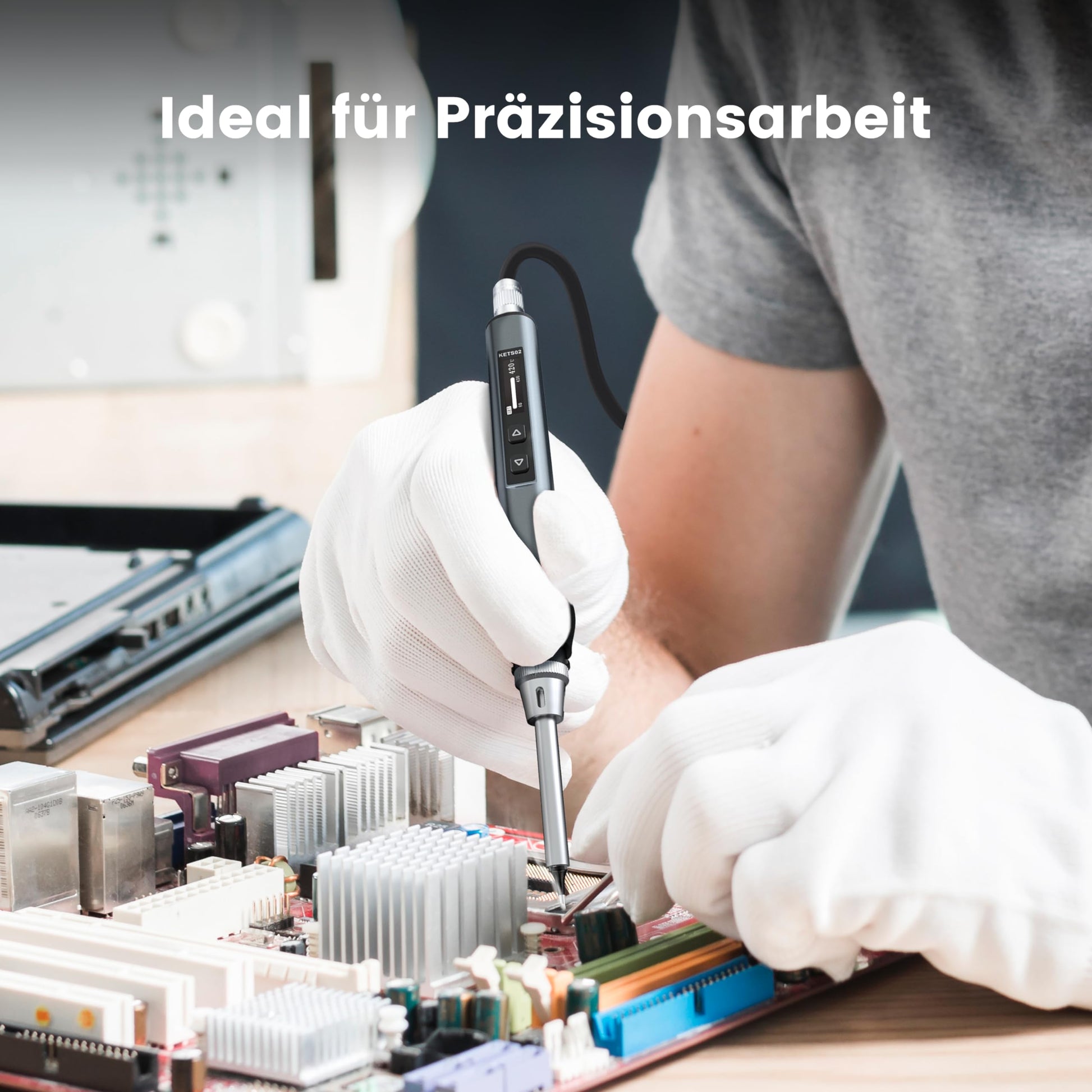 Der Lötkolben ist extrem schnell und in nur 8 Sekunden einsatzbereit. Die Temperatur lässt sich gradgenau von 80 °C bis 420 °C einstellen und auf dem OLED-Display überwachen. Diese präzise Kontrolle macht ihn ideal für feine Arbeiten an empfindlicher Elektronik wie Platinen, Drohnen oder Mobiltelefonen.