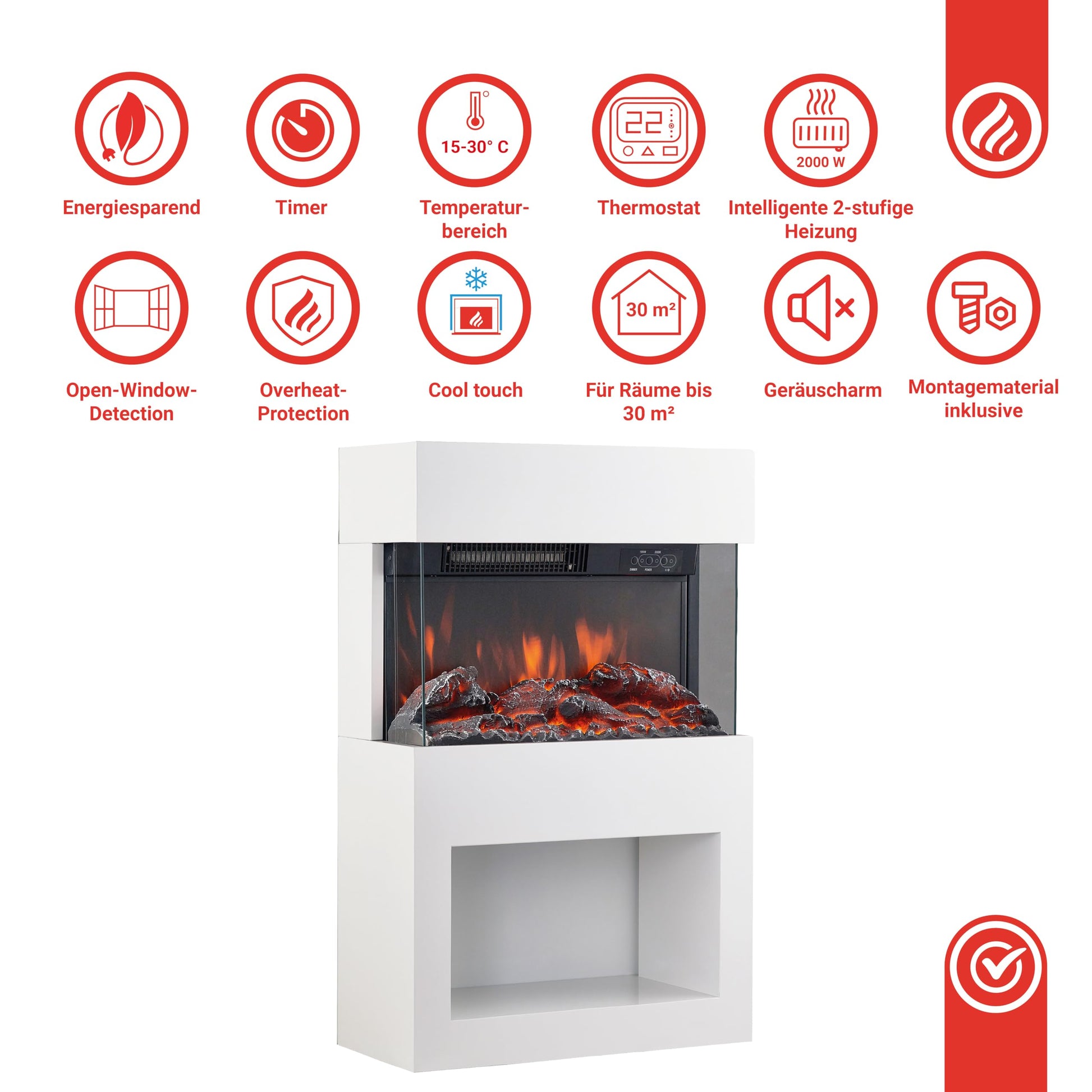 - Realistischer 3D-Flammeneffekt: Eine innovative und energiesparende Flammtechnologie erzeugt ein authentisches Kaminfeuer, dessen Helligkeit Sie in fünf Stufen individuell anpassen können.