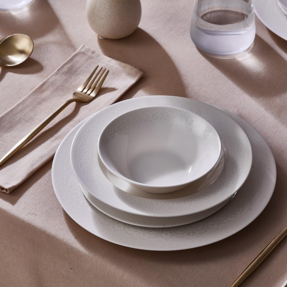 Das klare und minimalistische Design macht dieses Geschirrset zu einem wahren Allrounder. Es bildet die perfekte, unaufdringliche Bühne für Ihre kulinarischen Kreationen und fügt sich nahtlos in moderne wie auch klassische Einrichtungsstile ein. So verleihen Sie jeder Mahlzeit mühelos eine stilvolle und zeitlose Note.