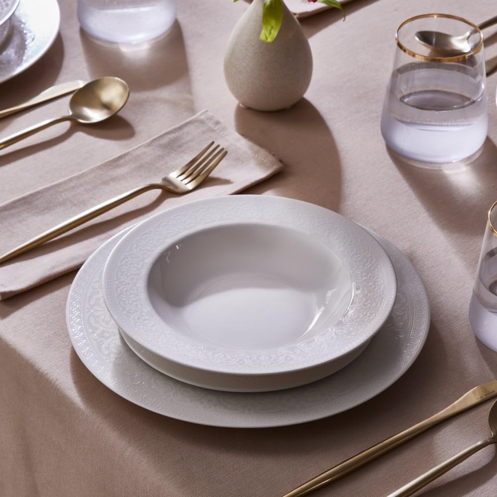 - Komplettes 6-Personen-Set: Beinhaltet je sechs Essteller (27 cm), Dessertteller (20 cm), tiefe Pastateller (22 cm) und Schalen für Suppe oder Müsli (14 cm).