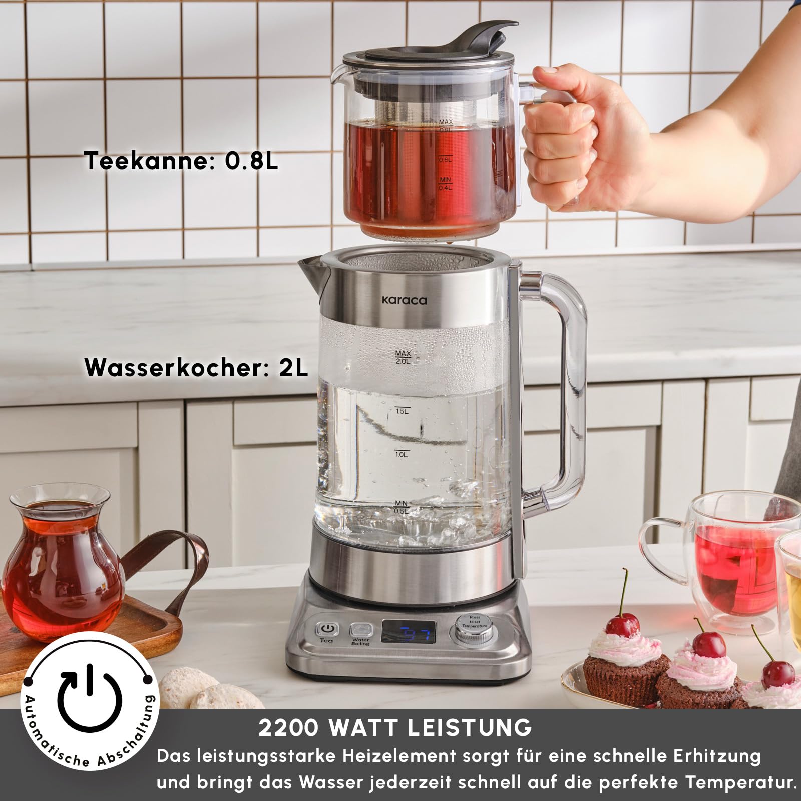 - Gesamtkapazität: 2,8 Liter (2 L Wasserkocher, 0,8 L Teekanne)